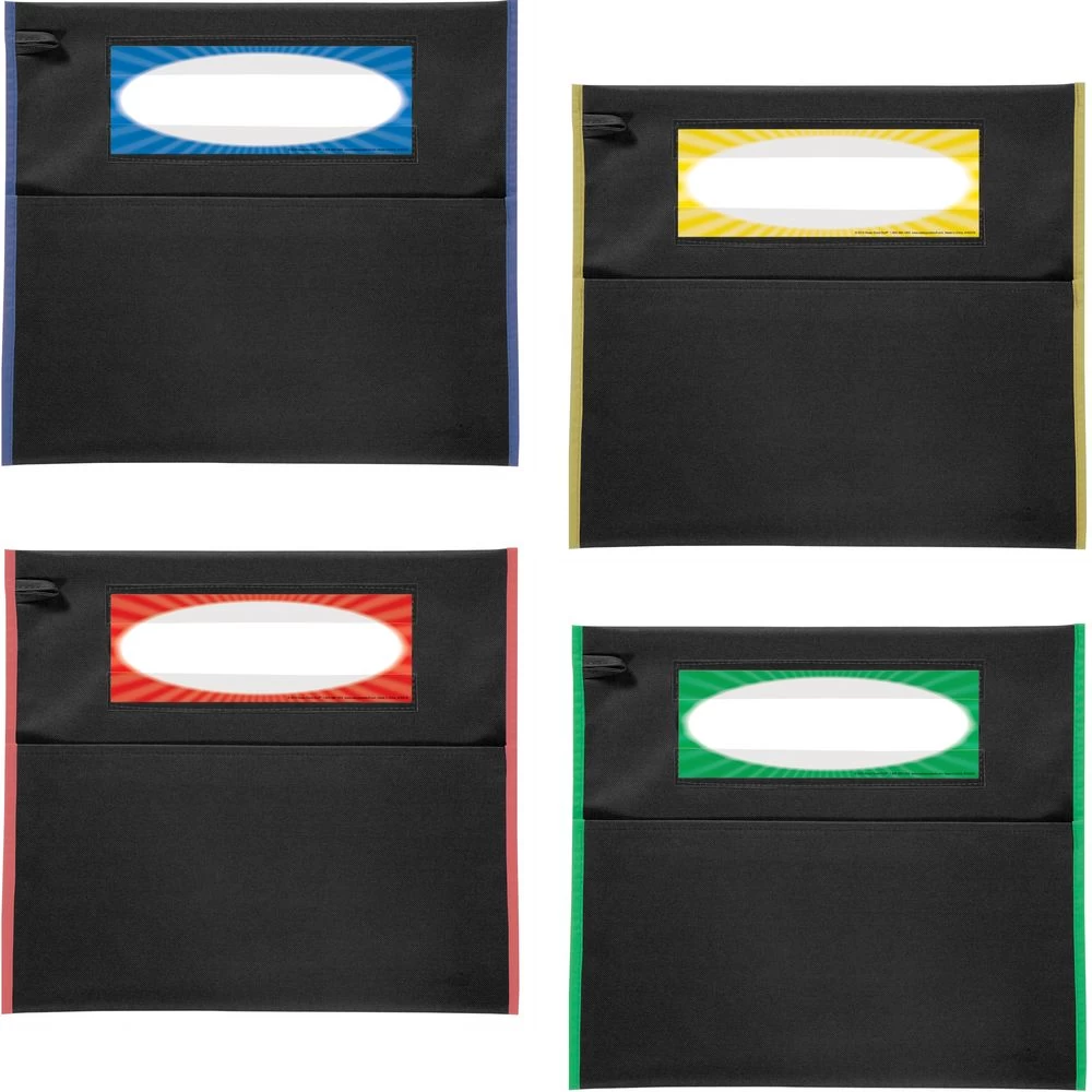 Made of strong, durable fabric with a stitched-on hanging loop, our chair pocket organizer is 16 1/2″ x 15″ (inside pocket width 16 1/2″ x 8 1/2″ deep), has a roomy storage pocket with open bottom corners and two metal rivets. A clear plastic sleeve on each chair pocket holds a replaceable name tag (size 9 3/4″ x 3 1/2″ each), so your chair pockets are an economical investment for your classroom that can be used year after year. In addition to helping students organize books and papers, our Grouping Chair Pockets in chic Black with color coded piping are durable and water resistant.