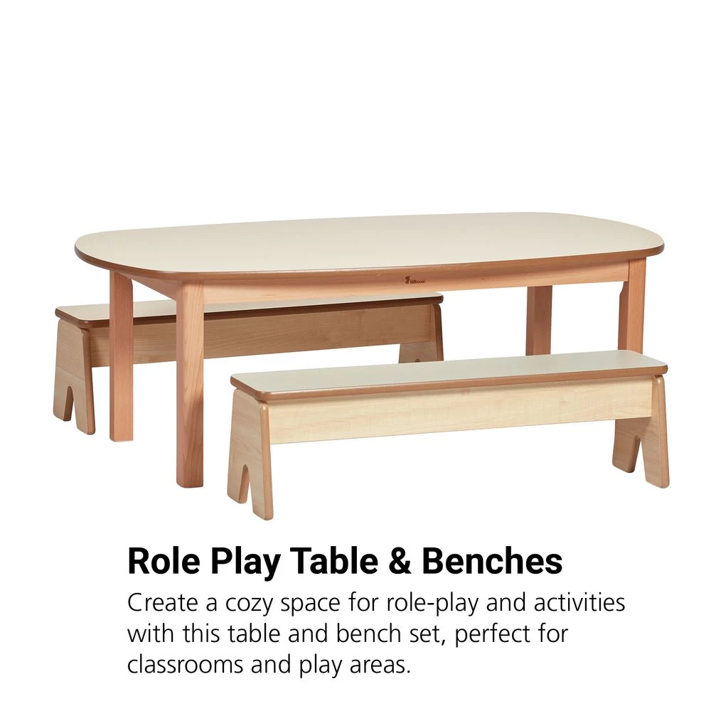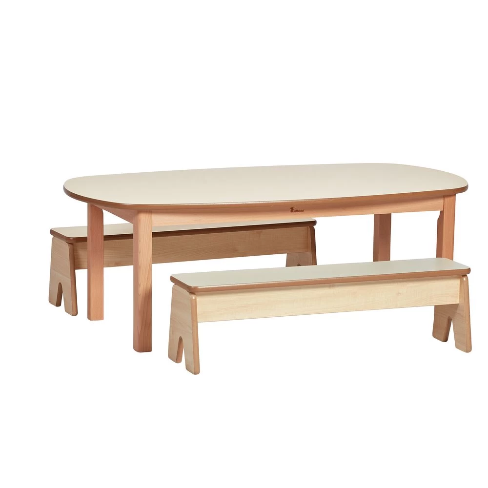 With a cream melamine top and curved design, this modern table and bench set is reminiscent of those found at home and is a beautiful addition to any setting. The benches are designed to neatly fit underneath the table for efficient storage and the table features a solid beech frame and legs for stability.