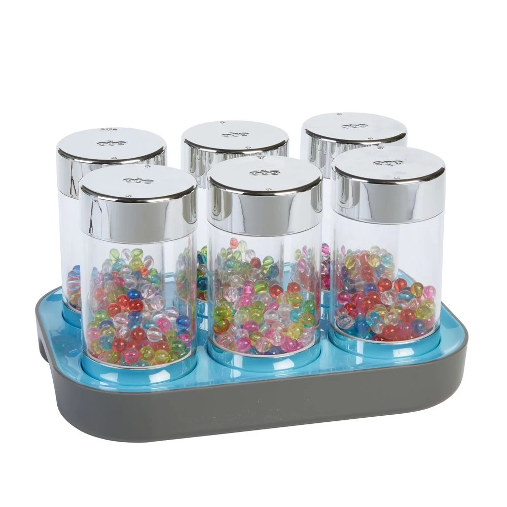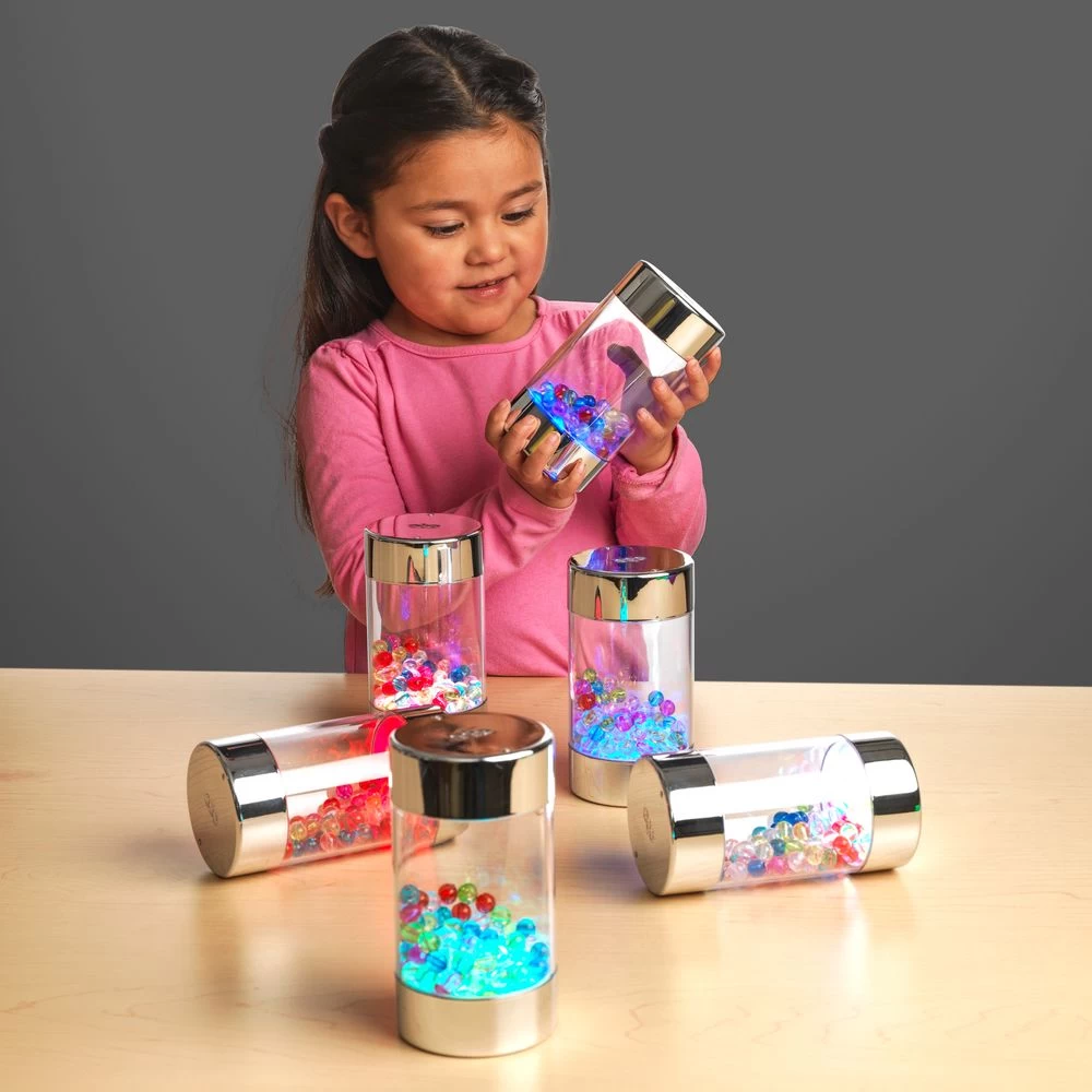 An engaging set of six metallic cylinders with illuminated contents for rolling, shaking, stacking, and turning. The shakers light up when switched on and provide an engaging and multisensory experience. An attractive docking station charges them and provides easy self access. Docking station measures 11″ L. The roller stays on the chosen color when it is turned on/off. They take 4 hours to fully charge and last approximately 5-6 hours. Wipe clean with a damp cloth, do not submerge in water.