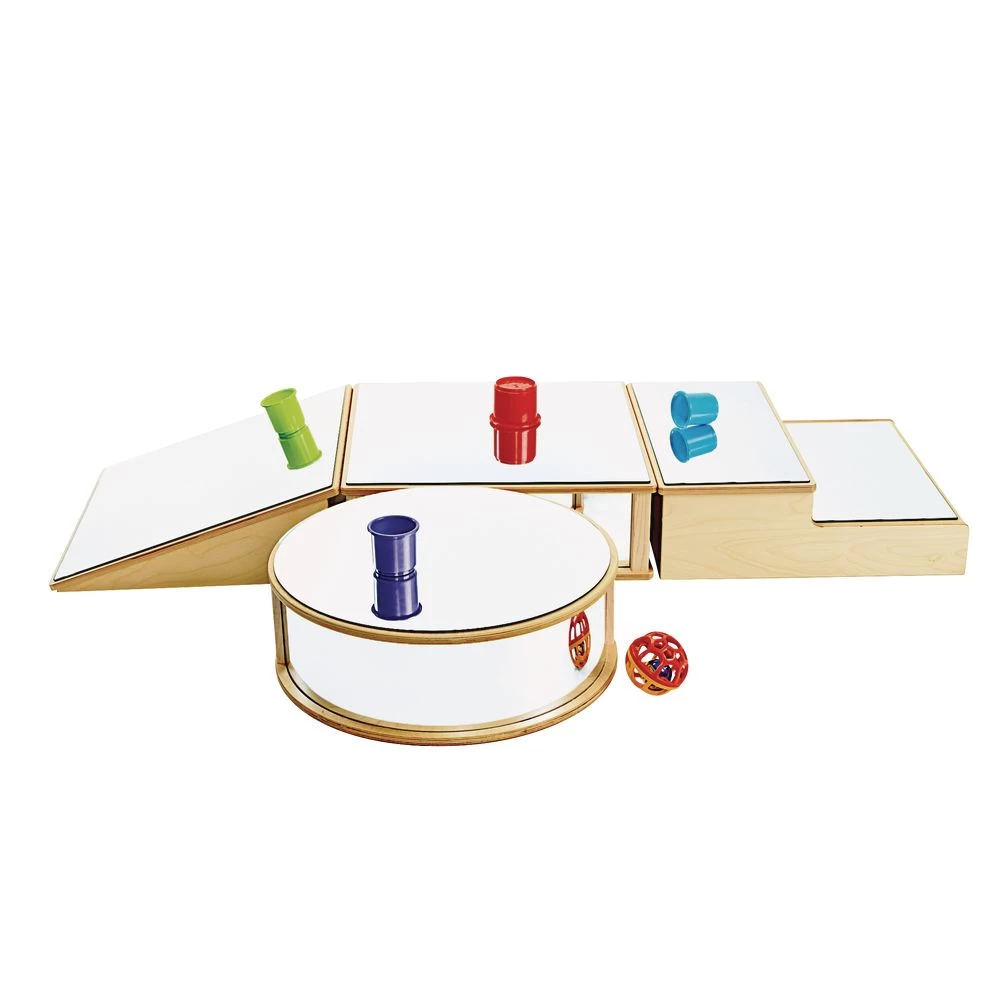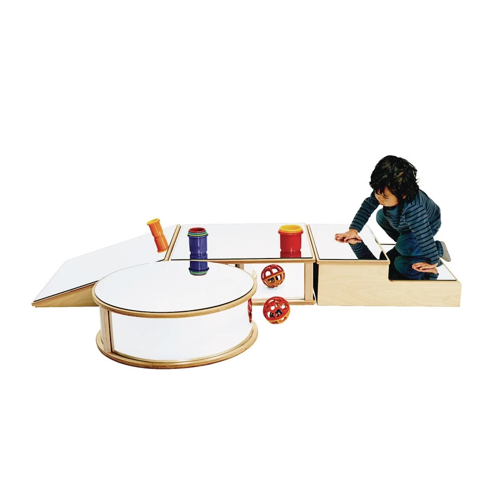Floor mirror blocks for first-movers! Mirrors are important tools that foster a young child’s self-awareness, self-esteem, intellectual curiosity and cognitive development. Set of 4 different mirrored shapes: round, square, ramp, and step. Recommended for ages 18 months and up.
