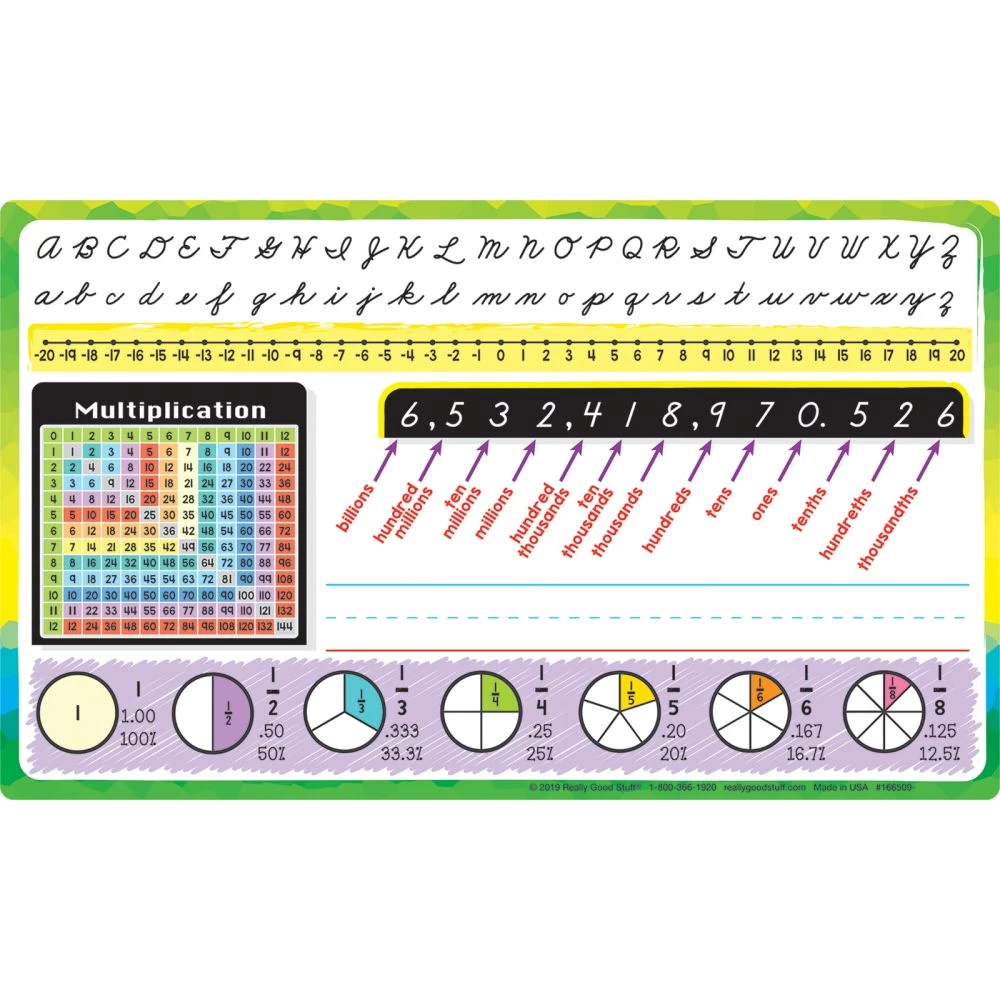 - VERSITILE LEARNING: Really Good Stuff’s on-the-go helpers pack a lot of useful information on one surface: a number line with negative integers, the cursive alphabet, fractions, a multiplication chart, and an illustration of decimal placement.