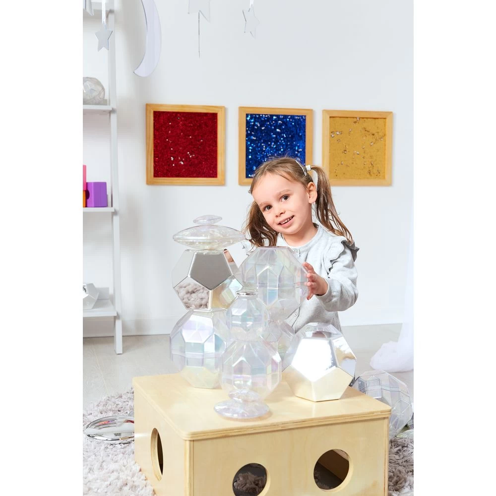 An absorbing lustrous collection of varying sized, multi-faceted, prismatic boulders for an array of play scenarios. There are three sizes of boulders which offer a challenge to carefully balance them in order to create glistening towers. See the colors dance as the children roll, stack, match and sort them or use them in their symbolic play. Incorporate this intriguing new shape into your block area to add rich variety. Set of 12 boulders. Accessories not included.
