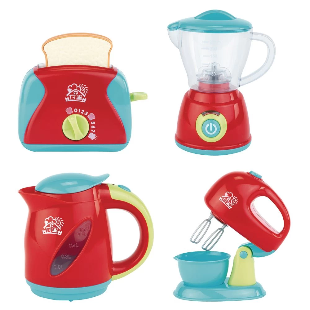 Set includes 6-1/2″L toaster, 8″H mixer, 8-1/2″H blender and 7-1/4″H coffee pot. Mixer requires 2 “AA” batteries and coffee pot and blender require 3 “AA” batteries (not included).Colors may vary.