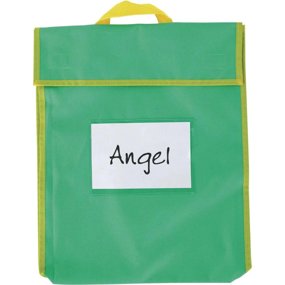 Be confident that books and assignments will make it from school to home and back (in one piece) with Really Good Stuff Store More Book Pouches. Keep books, folders, flash cards and homework together for students to take back and forth to school. Sturdy book bags also help students (and teachers!) stay organized in class. Match the colors of the bags to your reading groups. For independent work time, hang bags for students to quickly and easily retrieve and then put away their materials. Book pouches are perfect for younger kids as an alternative to backpacks that are often way too large. Use to organize assignments to send home with older kids so all homework is together in one place.Made of water-repellent, nylon fabric, the book and homework pouch measures 12″W x 15″H each with a 1″ diameter gusset to hold more books and folders. The sides and flaps are stitched with durable, non-rip seams. Each one includes a sturdy, stitched-on handle for easy carrying or hanging, hook-and-loop closures that stay in place and a clear pocket for name tags. Bags are durable and can be reused year after year. *SAFELY SEND HOME BOOKS: Send home books, assignments, flash cards and more in Really Good Stuff sturdy book pouches. Keep papers and books safe, without creases and all together for students to take back and forth to school. *FUN COLORS: Store More book bags come in four vibrant primary colors: blue, green, red and yellow. (Note: trim handle and trim may be slightly different shades of the same color)*ROOMY AND DURABLE: Made of water-repellent, nylon fabric, the homework pouch measures 12″W x 15″H with a 1″ diameter gusset to hold more items. The sides and flaps are stitched with durable, non-rip seams. A pouch includes a sturdy, stitched-on handle for easy carrying or hanging, hook-and-loop closures that stay in place and a clear pocket for name tags. Bags can be reused year after year. *STAY ORGANIZED: Store More large book pouches help students (and teachers!) stay organized. Match the colors of the bags to your reading groups. For independent work time, hang bags for students to quickly and easily retrieve and then put away their materials. *SUITS A VARIETY OF AGES: Book pouches are perfect for younger kids as an alternative to backpacks that are often too large. Use to organize assignments to send home with older kids so all homework is together in one place.