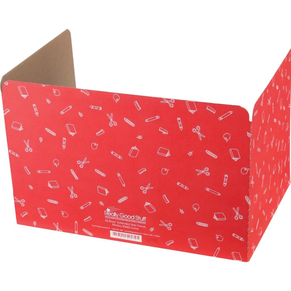 Provide Students with Extra Privacy and a Clear View of Classroom LessonsKeep eyes from wandering, eliminate distractions and help ensure focus and concentration on a daily basis with Privacy Shields from Really Good Stuff. Our attractive and functional Privacy Shields are made of sturdy corrugated cardboard.Printed with a whimsical school supplies pattern in a classic blue. These large privacy shields for desks are ideal for both pencil-and-paper and computer-based testing (including PARCC and other standardized tests). The large privacy shields are bigger and taller for extra privacy. The sides are high enough to help students avoid distraction, but low enough for you to easily monitor students’ work. They’re great for everyday use in classrooms, computer labs, or at home to create a barrier. Students love setting up “offices” with them too!Designed to fit standard desks, Really Good Stuff three-panel privacy dividers have a 22″ x 14″ center panel and the two side panels are 14″ x 16″ each. This privacy shield folds up into thirds for easy storage. It’s durable enough to withstand daily use on students’ desks and tabletops. These Privacy Shields will create a barrier to keep your students focused year after year.*STYLISH AND USEFUL: Includes (12) three-panel sturdy corrugated cardboard large privacy shield. They are printed with a whimsical school supplies pattern in a classic blue color. The center panel is 22″ x 14″ and the two side panels are 16″ x 14″ each.*HELP STUDENTS FOCUS: These large privacy shields are a must-have for teachers and parents because they help eliminate distractions in the classroom or at home.*CREATE A WORK STATION BARRIER: Large Privacy Shields are bigger and taller for extra privacy. The sides are high enough to help students focus, but low enough for you to easily monitor students work. Students feel like they have their own work station.*DURABLE AND EASY TO STORE: Our privacy shields are built to last. Made with sturdy corrugated cardboard to withstand daily use on students’ desks and tabletops. Folds up into thirds for easy storage. Really Good Stuff’s Privacy Shields are built to last year after year.*ECONOMICAL: These are a low-cost, long-term option that can be used in any classroom or home year after year.