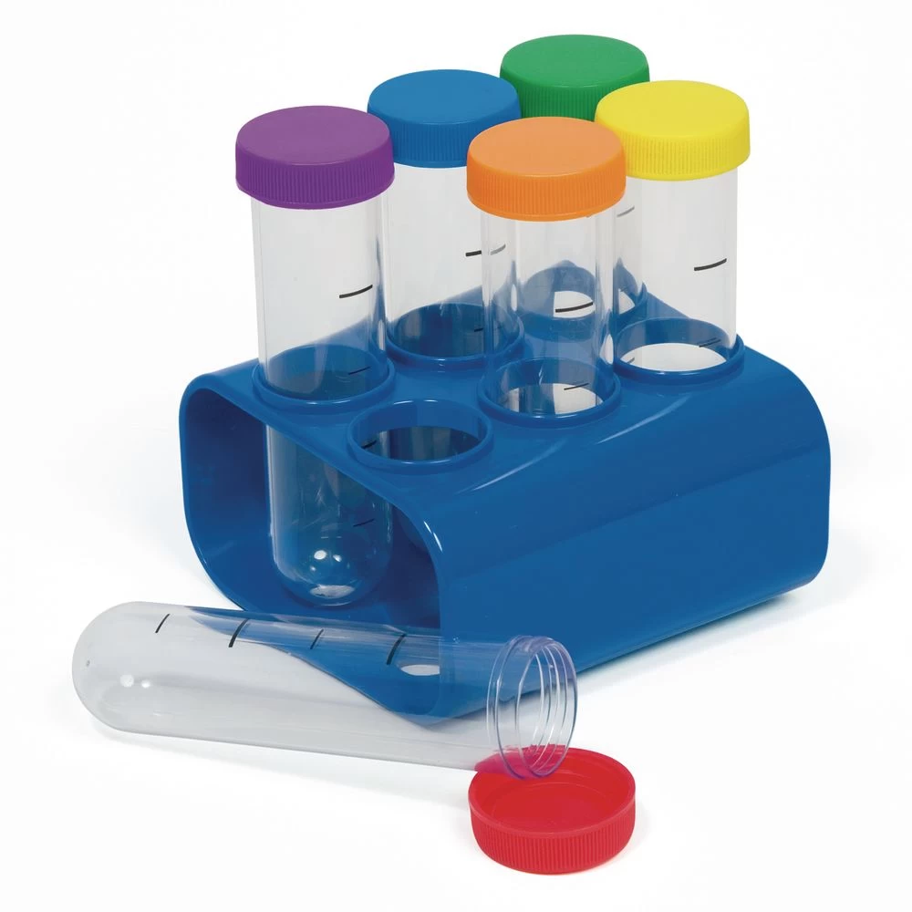 Durable plastic test tubes for early science experiments. Each has calibration marks and different colored lids. Set of six 6-1/4″H test tubes. Comes with sturdy rack.