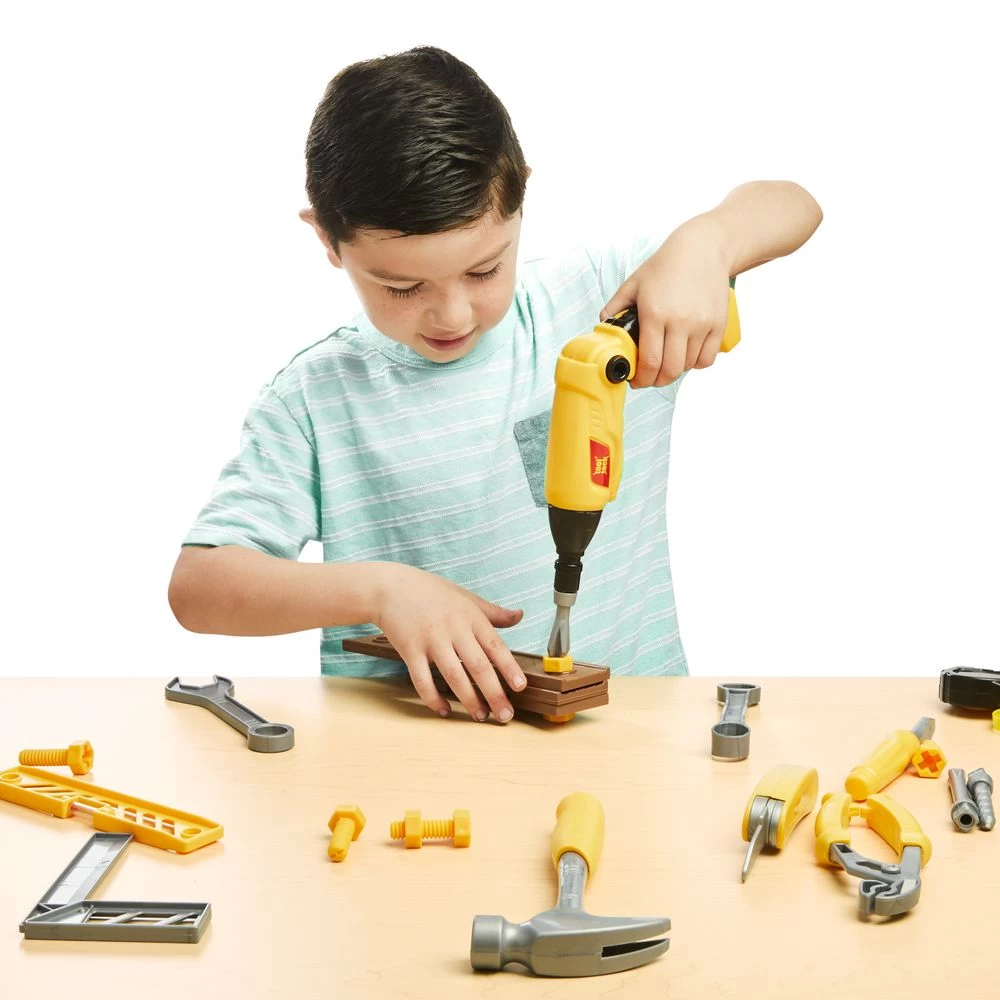 - SET INCLUDES: Lights and sounds bendable screwdriver with three bits, two wrenches, screwdriver, hammer, square ruler, level ruler, tape measure, swiss knife, pipe wrench, three wood pieces, two nails, 11 bolts and 11 nuts.