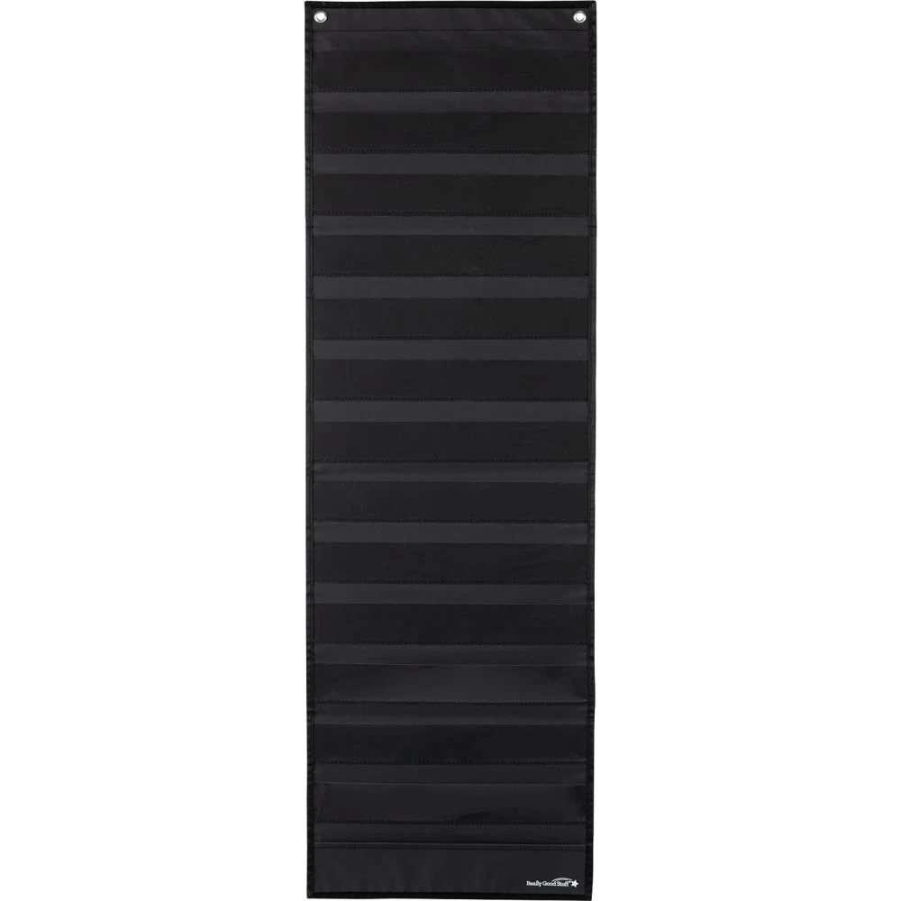 Quality Black Pocket Chart Will Quickly Become Your Classroom Go-To ToolYoull find so many uses in your classroom for this long, compact, and incredibly durable pocket chart! Constructed of tough nylon and vinyl with 13 acetate pockets, it also has a convenient storage pocket at the bottom. Hang it by the metal grommets or by the 2″ wide magnetic strip on the back.*Durably Constructed: Made of strong nylon and vinyl, this top- quality pocket chart is designed to last. Its a great investment for any elementary classroom.*14″ By 44″: This long, slim pocket chart has 13 acetate pockets to hold cards or sentence strips.*Goes With Any Dcor: The sharp black color blends with any classroom color scheme.*So Versatile! You can use this multipurpose chart to manage behavior, display classroom jobs, teach lessons in any subject, and so much more.*Two Ways To Hang It: The chart has two strong grommets along the top for hanging and a 2″ wide magnetic strip on the back that adheres to a whiteboard or any other magnetic surface.*Handy Storage Pocket: Store cards, dry erase markers, and more in the handy pocket conveniently located along the bottom of the chart.Add this long, narrow pocket chart to your lineup of classroom resources, and youll soon wonder how you ever did without it!