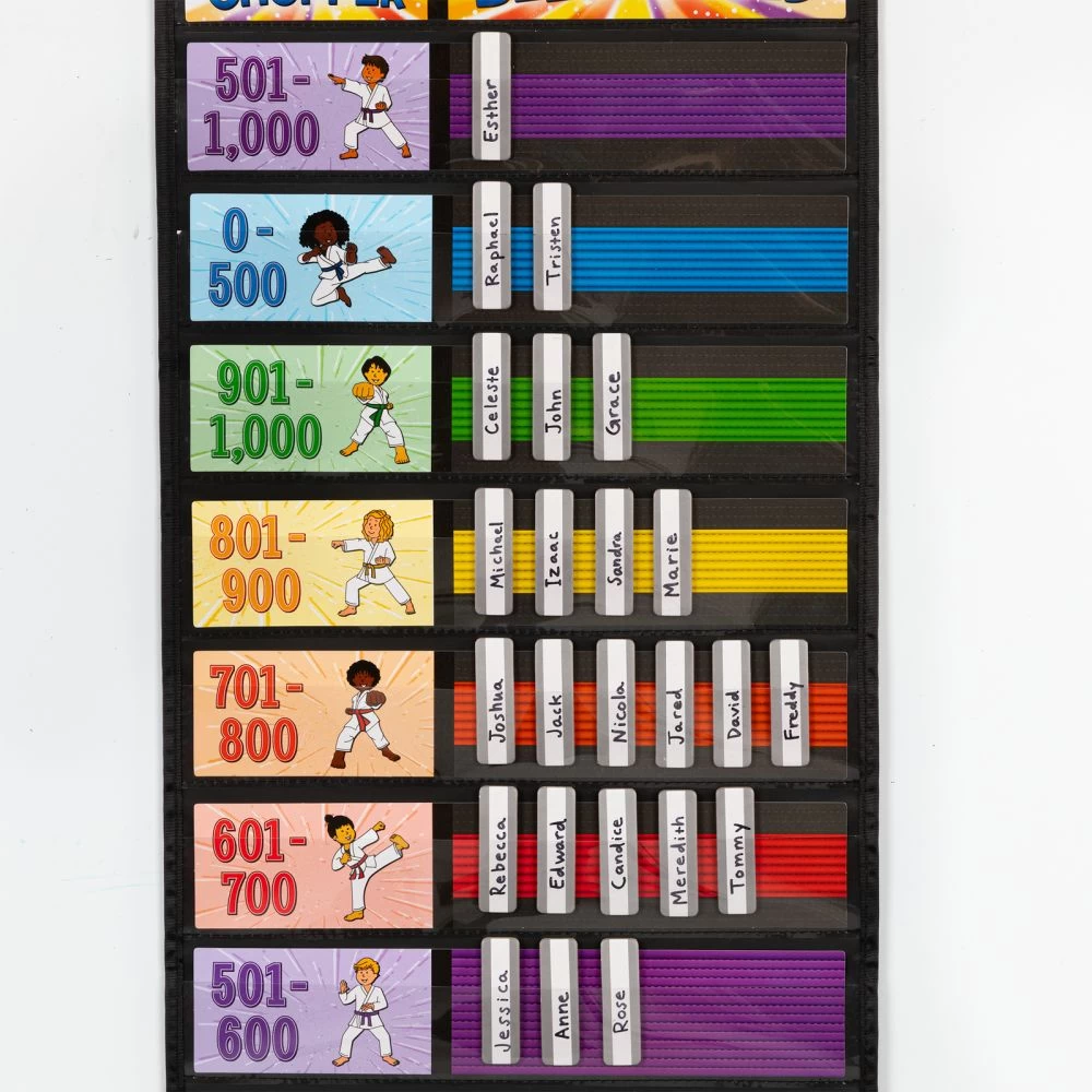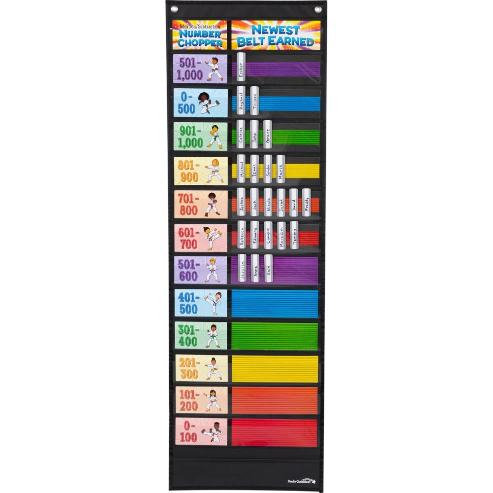 Students earn belts as they master their addition and subtraction facts level by leveljust like in karate! As they move up the ranks, they color in their own personal belt rack. The Guide includes reproducible practice tests and actual tests, certificates, and a log for students to keep track of their accomplishments.*Karate-Themed Reward System Motivates Kids: With this unique karate-based reward system, kids will push themselves to work their way up from their white belt to their black belt as they master increasingly difficult addition and subtraction facts through 1,000.*Display Goals In The Pocket Chart: The sturdy, laminated cards slip easily into the pockets of the chart to remind students of what they are striving toward. The pocket chart has a convenient storage pocket at the bottom.*Guide Includes Reproducible Tests, Certificates and More! The Really Good Instructional Guide offers blackline masters for you to copy, including practice tests, real tests, certificates, and a log sheet on which students can keep track of their personal progress and accomplishments as they master their math facts and move up the ranks.Give kids an incentive to master addition and subtraction facts through 1,000 with this unique, karate-based reward system.