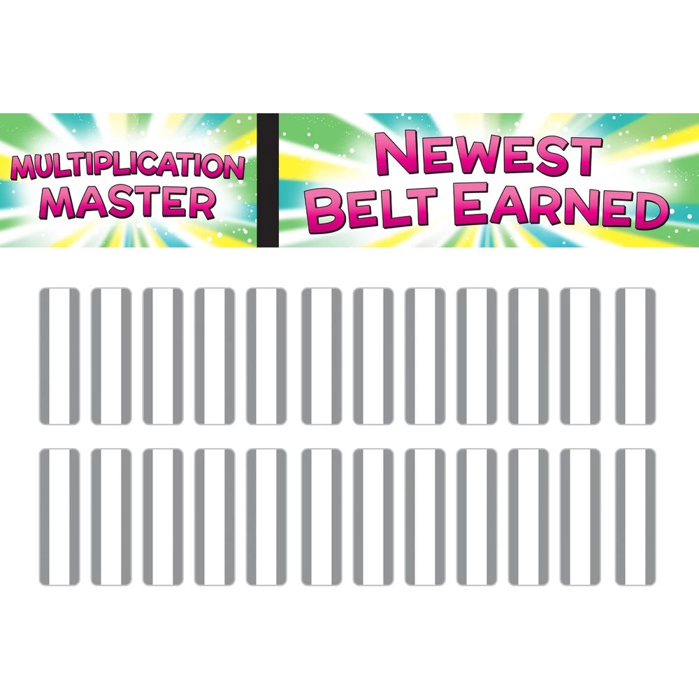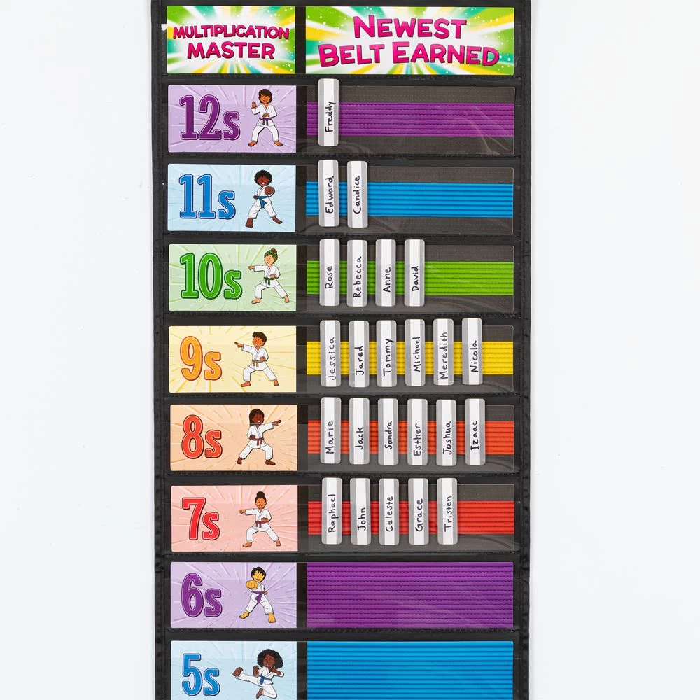 Students earn belts as they master the multiplication table level by leveljust like in karate! As they move up the ranks, they color in their own personal belt rack. The Guide includes reproducible practice tests and actual tests, certificates, and a log for students to keep track of their accomplishments.*Karate-Themed Reward System Motivates Kids: With this unique karate-based reward system, kids will push themselves to work their way up from their white belt to their black belt as they master increasingly difficult multiplication facts through 12.*Display Goals In The Pocket Chart: The sturdy, laminated cards slip easily into the pockets of the chart to remind students of what they are striving toward. The pocket chart has a convenient storage pocket at the bottom.*Guide Includes Reproducible Tests, Certificates and More! The Really Good Instructional Guide offers blackline masters for you to copy, including practice tests, real tests, certificates, and a log sheet on which students can keep track of their personal progress and accomplishments as they master their math facts and move up the ranks.Give kids an incentive to master the multiplication table through 12 with this unique, karate-based reward system.