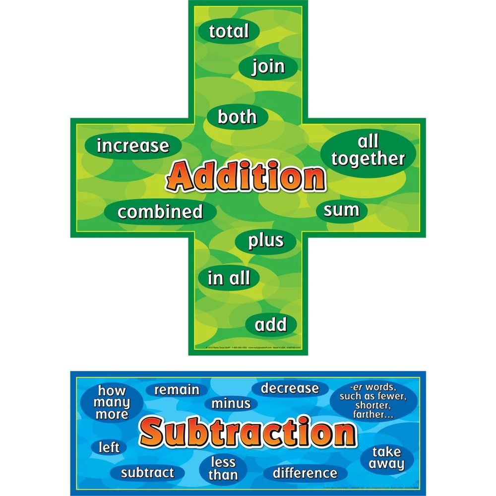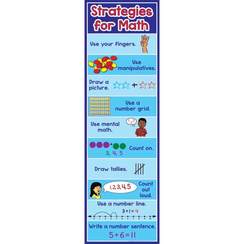 2 Addition-Subtraction Words Posters (#160749) * Size: 17″ by 17″ and 17″ by 6″ * 1 Counting Days With Ten-Frames Banner (#163178) (up to 100th Day on one side/beyond 100th Day on reverse) * Size: 12″ by 39″ * Write AgainA® wipe-off laminate * 1 Numbers From 1 To 120 Poster (#161319) * Size: 19″ by 24″ * Write AgainA® wipe-off laminate * 1 Strategies For Math Banner (#161887) * Size: 12″ by 39″ * 1 Number Of The Day Poster (#159761) * Size: 19″ by 24″ * Write AgainA® wipe-off laminate * 5 Really Good Instructional Guides