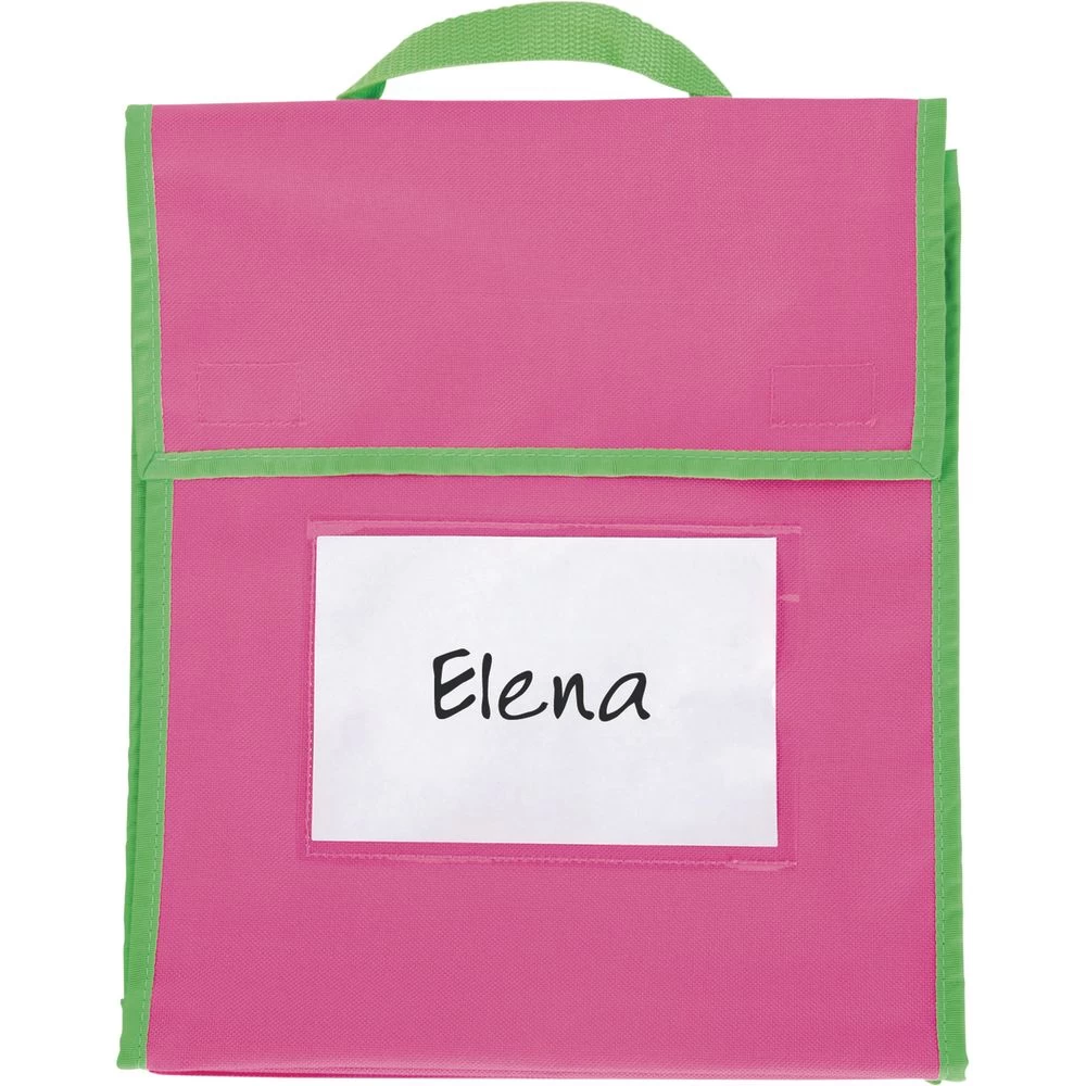Book pouches are perfect for younger kids as an alternative to backpacks that are often way too large. Use to organize assignments to send home with older kids so all homework is together in one place. Made of water-repellent, nylon fabric, the book and homework pouch measures 10″W x 12″H each with a 1″ diameter gusset to hold more books and folders. The sides and flaps are stitched with durable, non-rip seams. Each one includes a sturdy, stitched-on handle for easy carrying or hanging, hook-and-loop closures that stay in place and a clear pocket for name tags. Bags are durable and can be reused year after year.