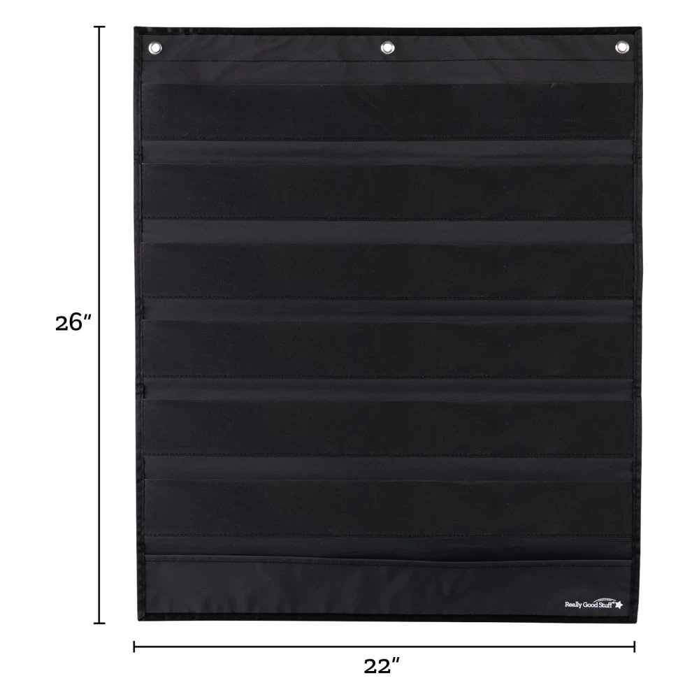 Quality Black Pocket Chart Will Quickly Become Your Classroom Go-To ToolYoull find so many uses in your classroom for this attractive and incredibly durable pocket chart! Constructed of tough nylon and vinyl with six acetate pockets, it also has a convenient storage pocket at the bottom. Hang it by the metal grommets or by the 2″ wide magnetic strip on the back.*Durably Constructed: Made of strong nylon and vinyl, this top- quality pocket chart is designed to last. Its a great investment for any elementary classroom.*22″ By 26″: This pocket chart has six acetate pockets to hold cards or sentence strips.*Goes With Any Dcor: The sharp black color blends with any classroom color scheme.*So Versatile! You can use this multipurpose chart to manage behavior, display classroom jobs, teach lessons in any subject, and so much more.*Two Ways To Hang It: The chart has three strong grommets along the top for hanging and a 2″ wide magnetic strip on the back that adheres to a whiteboard or any other magnetic surface.*Handy Storage Pocket: Store cards, dry erase markers, and more in the handy pocket conveniently located along the bottom of the chart.Add this versatile pocket chart to your lineup of classroom resources, and youll soon wonder how you ever did without it!