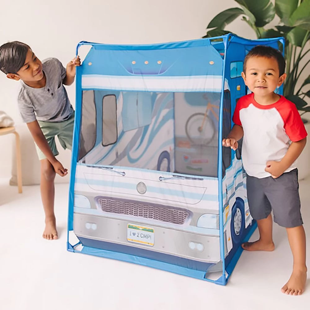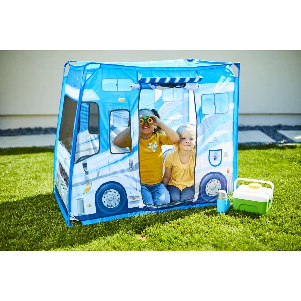 Explore the outdoor experience of hitting the road for a pretend camping adventure with the easy-to-assemble Melissa & Doug Let’s Explore™ Camper Tent Play Set! Take imaginations for a spin in the 47” x 31” x 39” RV-shaped tent with door and roof flaps, screen windows, an inside storage pocket, and lots of realistic illustrated details. Map out road trips on the reusable activity booklet and personalize the removable license plate. The play tent folds up and fits in a handy storage bag for easy cleanup! Let’s Explore™ encourages kids three and older to connect with the natural world through imaginative play. Discover the joy of outdoor adventures that instill curiosity and confidence while inspiring kids to say, “Let’s Explore™”!