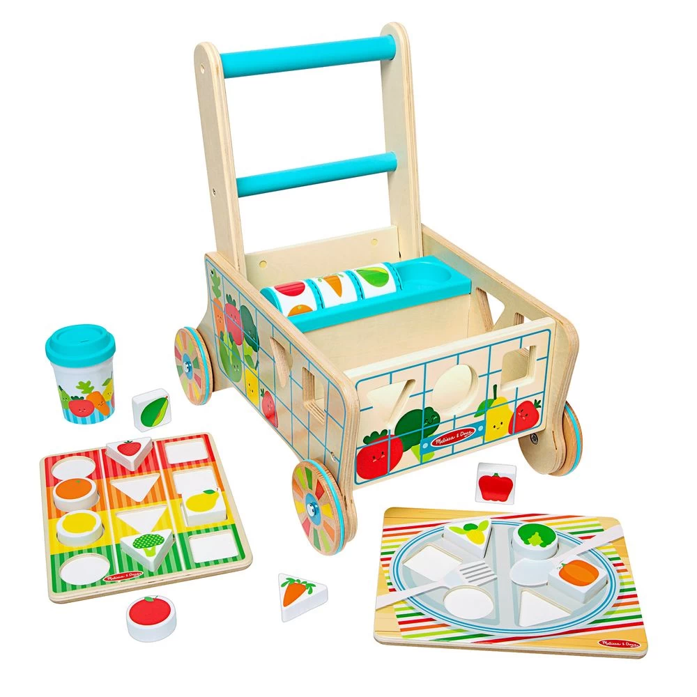 This cheery and sturdy wooden grocery cart is filled with fun skill-building activities! Very young kids can sort colorful chunky wooden food shapes through holes in the sides of the cart, and place them in two wooden puzzle boards that store in the cart. Spin the built-in roller drum for sensory stimulation and matching games, and enhance imitative pretend play with a realistic coffee cup with removable lid that fits in a cup holder in the cart! As kids grow, using the cart as a push toy helps build motor skills and inspire imaginative play. A great way to encourage kids 12 months and older to explore problem-solving and cause-and-effect. Assembled cart measures 15.5 inches tall, 10.75 inches wide, 15 inches long. Melissa & Doug infant and toddler toys inspire “a-ha!” moments of discovery. Adorable, diverse characters and a variety of fun shapes and textures encourage exploratory, skill-building play.
