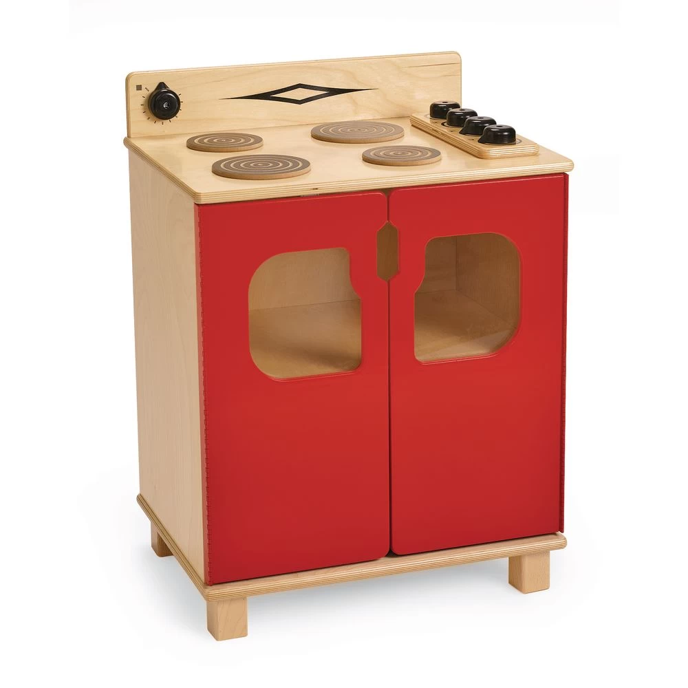 Sylish, state-of-the-art kitchen has beautiful color accents and realistic touches, such as raised burners and knobs on the stove and see-through oven doors for added play value.