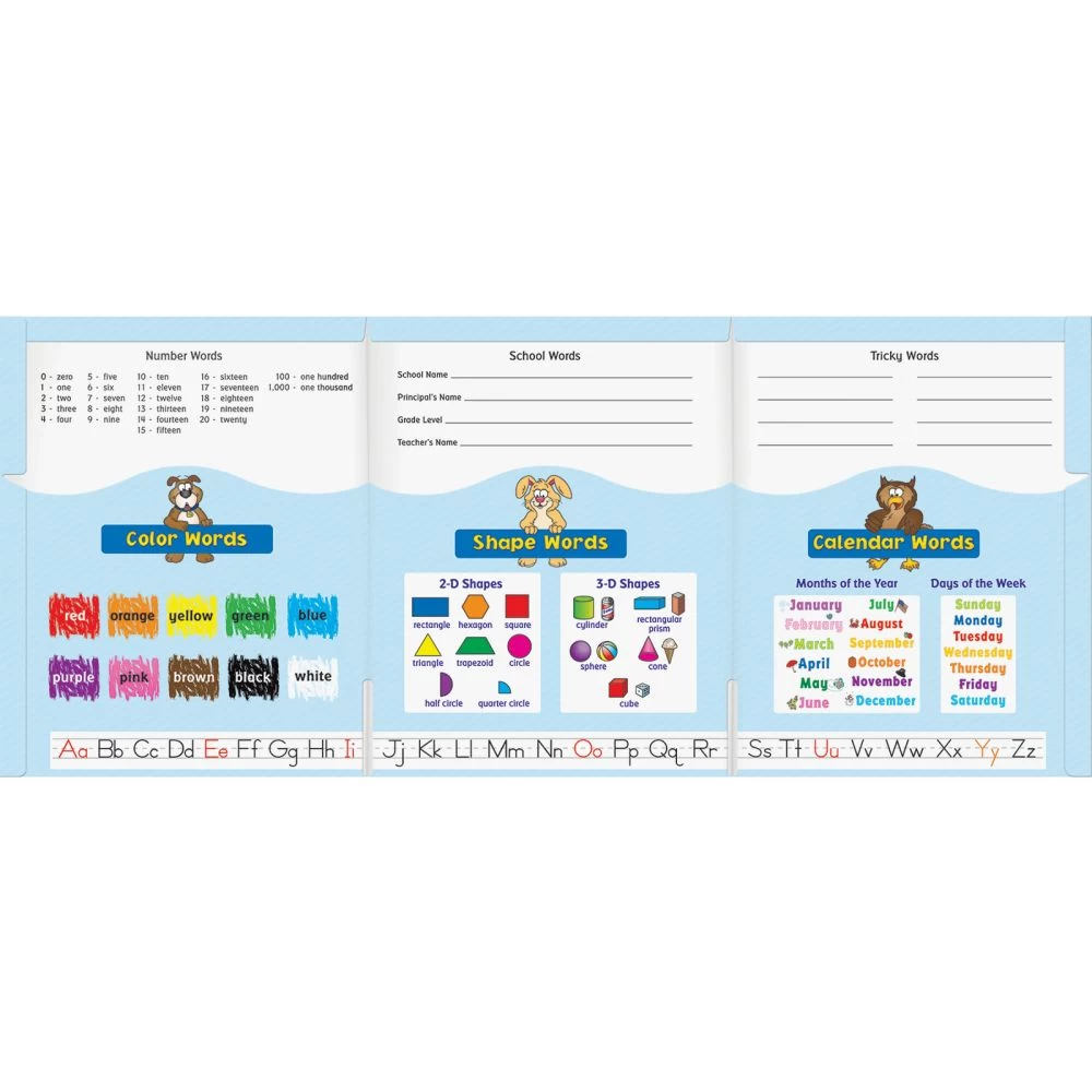It’s easy to help your students stay organized and store their writing work with this set of 12 Trifold 3-Pocket Folders that give students everyday reference for words to use in their writing. The front cover features a fun group of writers and primary writing lines for a student’s first and last name. The inside has 3 labeled pockets with number words, color words, 2- and 3-D shape words, calendar words (days of the week and months of the year), and a place for students to record school words and tricky words. The inside also includes a letter formation alphabet with consonants in black and vowels in red. The back cover features reference for quality writing requirements, punctuation marks and examples, and high-frequency sight words. It’s a perfect writing tool for your young learners!