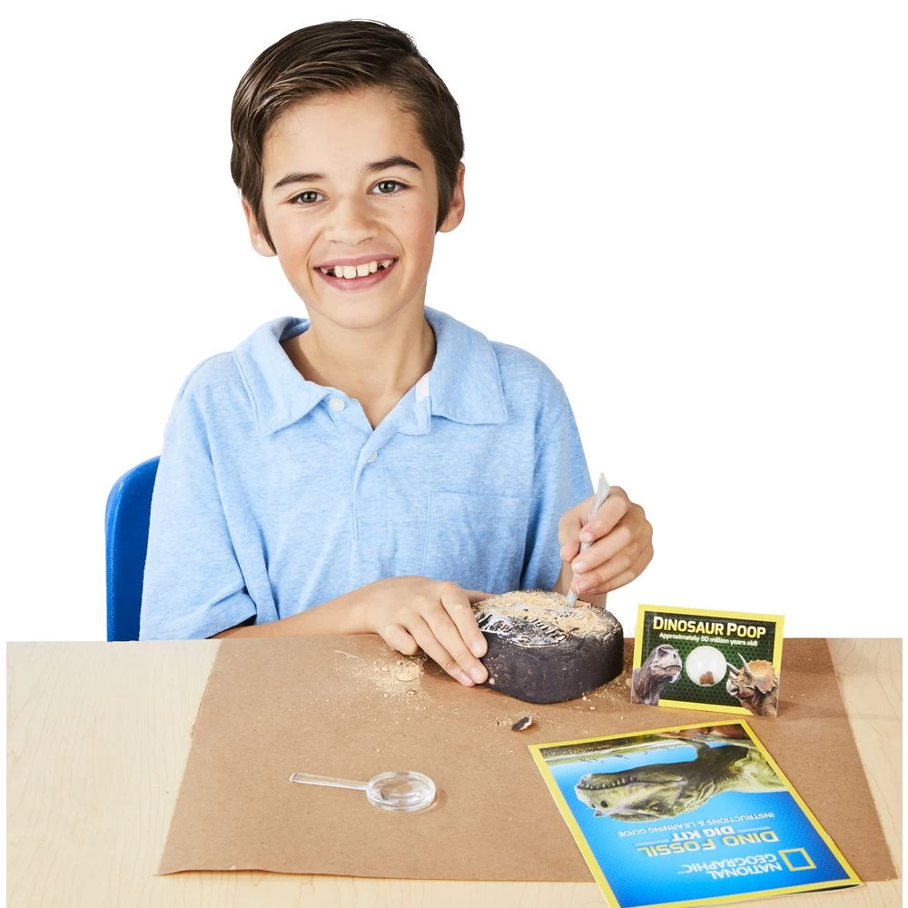 - KIT INCLUDES: Extra large dig brick with T-rex tooth fossil replica, dig tools and brush for your young Paleontologist, genuine coprolite (dino poop) fossil, detailed learning guide packed with educational information about fossils, paleontology, and the mighty T-rex