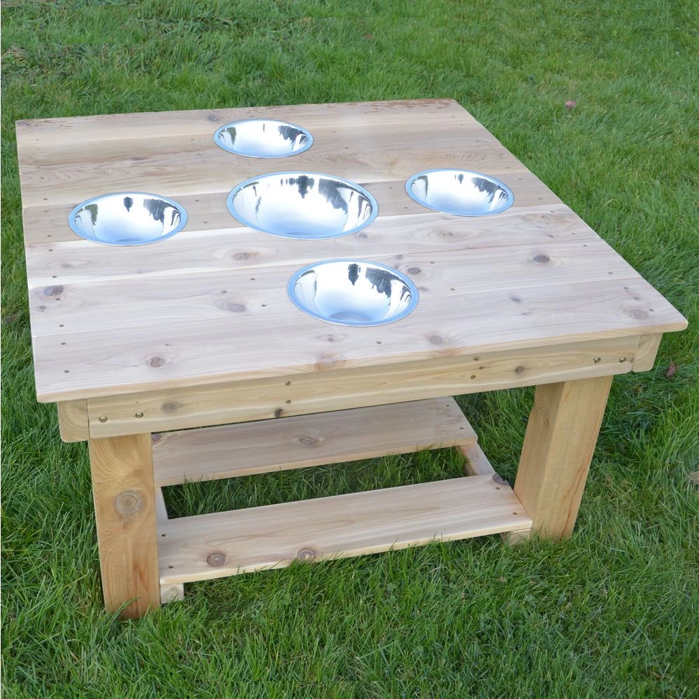 A versatile, sturdy table for experimenting and exploring different materials. Encourage collaborative experimentation with this four-sided activity table. Creativity will soar as children use the different bowls to mix, mash and mold. Featuring 5 metal, removable mixing bowls and a lower shelf for accessory storage. Use as part of a messy play area/collection or as a stand-alone piece. Made of natural North American Cedar which is guaranteed against rot and insect infestation for 5 years and provides excellent resistance to moisture.