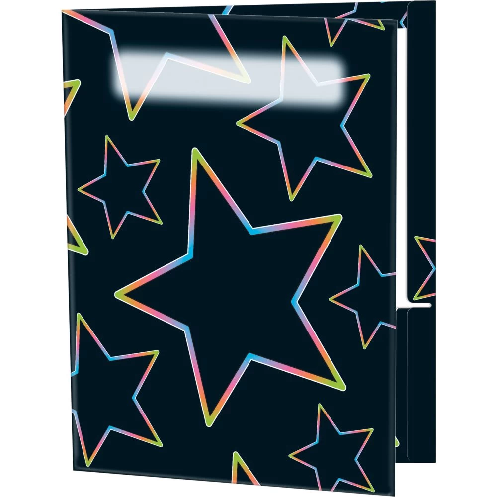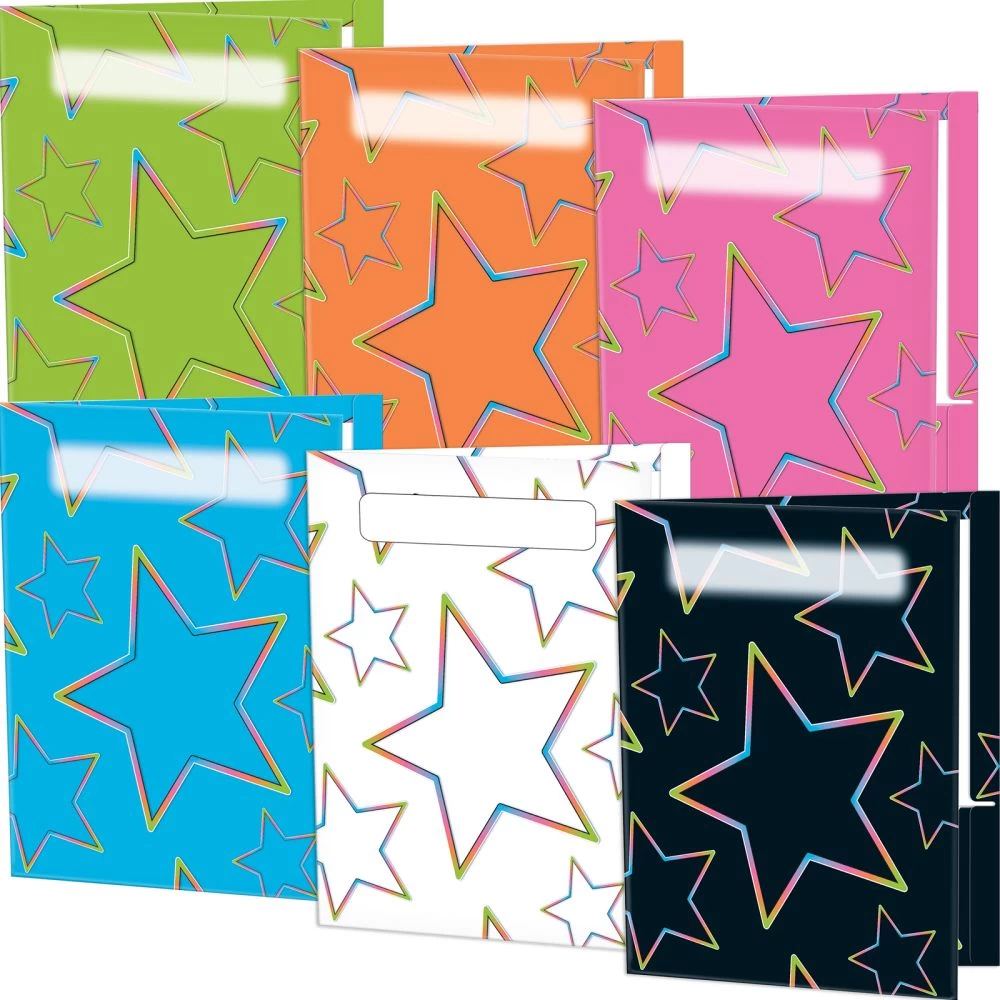 This set of 12 two-pocket folders will brighten your classroom with its star design in six Neon Pop colors. It’s a great way to color-code by student groups or subjects.*Laminated For Durability: These sturdy folders are made to last all year.*Customizable: The front cover has a space for the student’s name, and the pockets have a blank area to label any way you like.*Color-Coded For Easy Organization: This set of 12 includes two folders in six different Neon Pop colors and mdash;perfect for color-coding.*Complements The Rest Of Our Neon Pop Line: These bright folders fit right into your Neon Pop decorating scheme. Check out our plastic organizers in complementary neon colors (sold separately)!Order these bright folders to add color to your classroom while helping students stay organized.