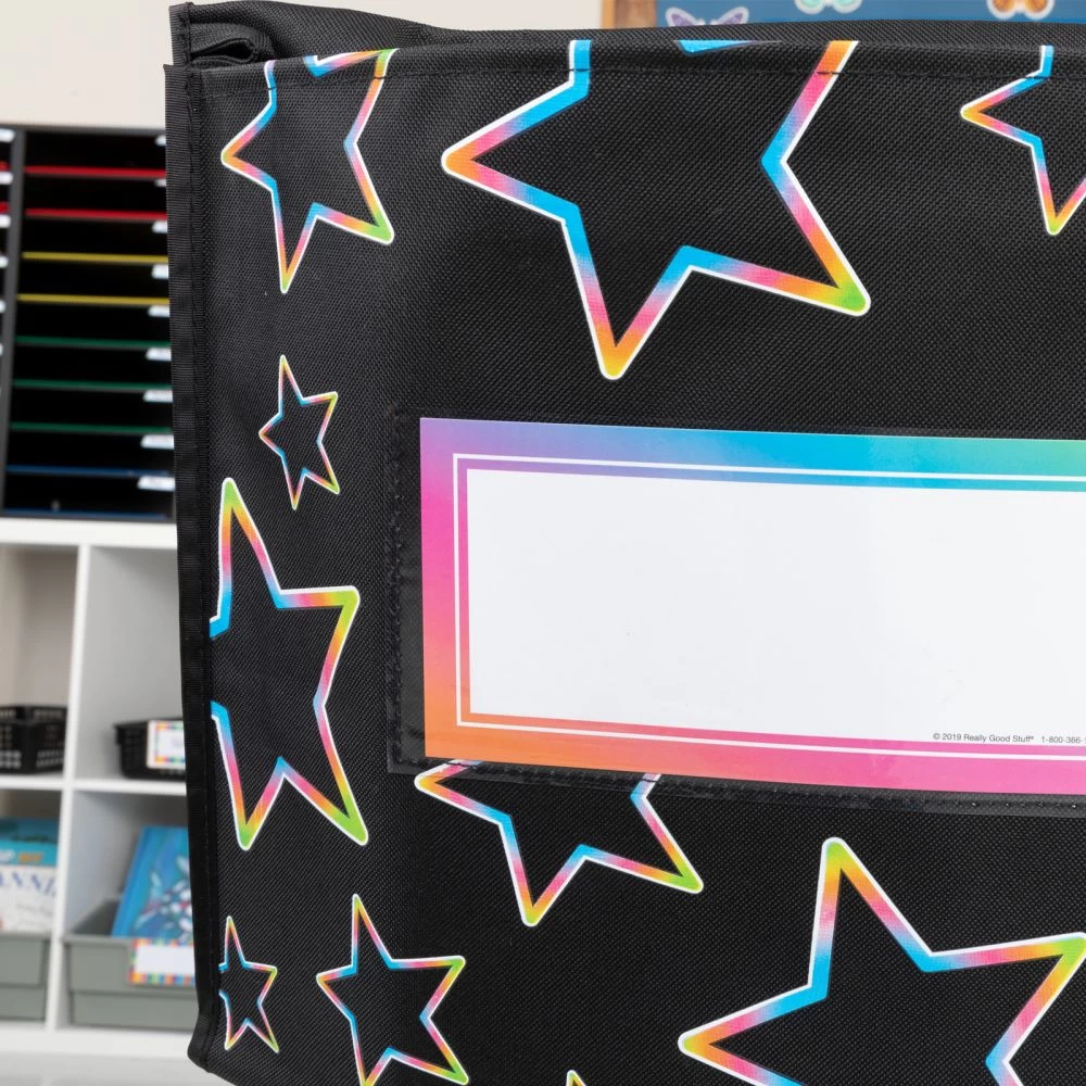 Your Space Saving Storage Solution! These Chair Pockets are a must-have for in the classroom or at home, they allow you to save space for easy organization. Give Your Room A Sharp New Look With Really Good Stuff Chair Pockets.Really Good Stuff Chair Pockets offer roomy gusseted pockets and a clear plastic sleeve which hold a replaceable name tag. Choose a style and color that best fits your classroom. Efficiently and effectively managing your classroom is one of your many keys to a successful school year. Keep your students – and yourself – organized with Really Good Stuff Store More Deep Pocket Chair Pockets. Chair pockets have a roomy storage pocket, fit comfortably over the students chair, and don’t need to be tied to the chair. They will stand up to your energetic students and are easily spot cleaned if a kid-sized mess should happen.Made of strong, durable fabric with a stitched-on hanging loop, our chair pocket organizer is 17″ x 13″ (inside pocket width 16″ by 12″ deep), has a roomy storage pocket with open bottom corners and two metal rivets. A clear plastic sleeve on each chair pocket holds a replaceable name tag (size 9 ¾” x 3 ½” each), so your chair pockets are an economical investment for your classroom that can be used year after year. In addition to helping students organize books and papers, our Store More Deep Pocket Chair Pockets are durable and water resistant.Available in a variety of styles, fun colors and designs, Really Good Stuff chair pockets will add a colorful touch to your classroom dÉcor and keep your room and students organized.