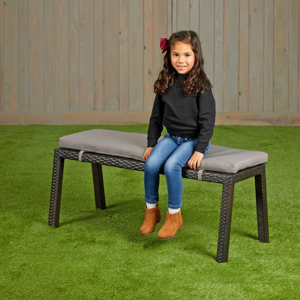 Classic yet contemporary design with clean lines and neutral palette complements any decor. Bench has thick foam cushion with sun-resistant fabric cover and provides sturdy seating for kids outdoors. Size is recommended for ages 5 and up.