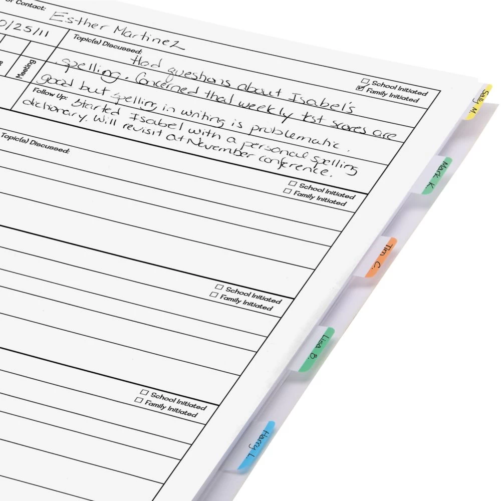 Each page features sections for you to record information on school related phone calls, e-mails, notes, or meetings throughout the year. You can easily create a section for each student with the included self-stick tabs.