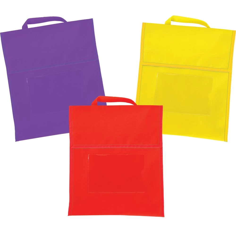 Be confident that books and assignments will make it from school to home and back (in one piece) with Really Good Stuff Store More Book Pouches. Keep books, folders, flash cards and homework together for students to take back and forth to school. Sturdy book bags also help students (and teachers!) stay organized in class. Match the colors of the bags to your reading groups. For independent work time, hang bags for students to quickly and easily retrieve and then put away their materials. Book pouches are perfect for younger kids as an alternative to backpacks that are often way too large. Use to organize assignments to send home with older kids so all homework is together in one place. Made of water-repellent, nylon fabric, the book and homework pouch measures 10″W x 12″H each with a 1″ diameter gusset to hold more books and folders. The sides and flaps are stitched with durable, non-rip seams. Each one includes a sturdy, stitched-on handle for easy carrying or hanging, hook-and-loop closures that stay in place and a clear pocket for name tags. Bags are durable and can be reused year after year.