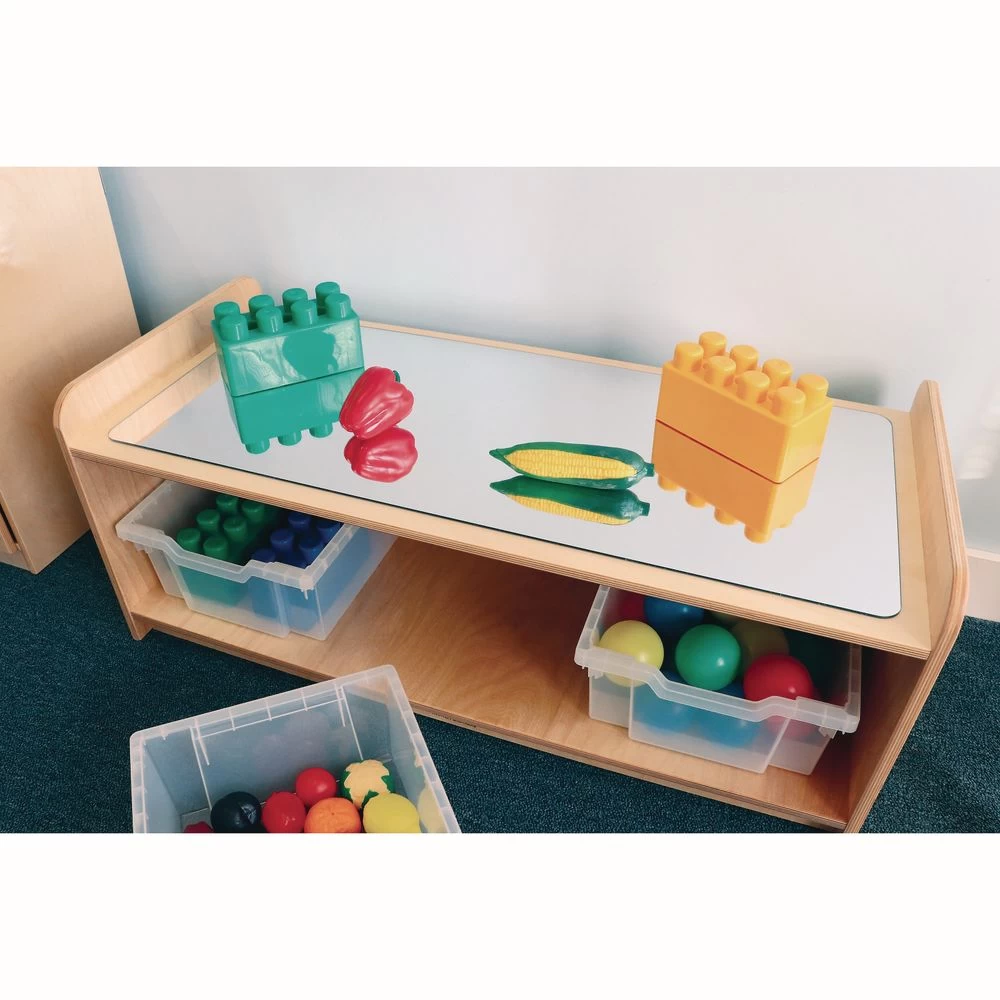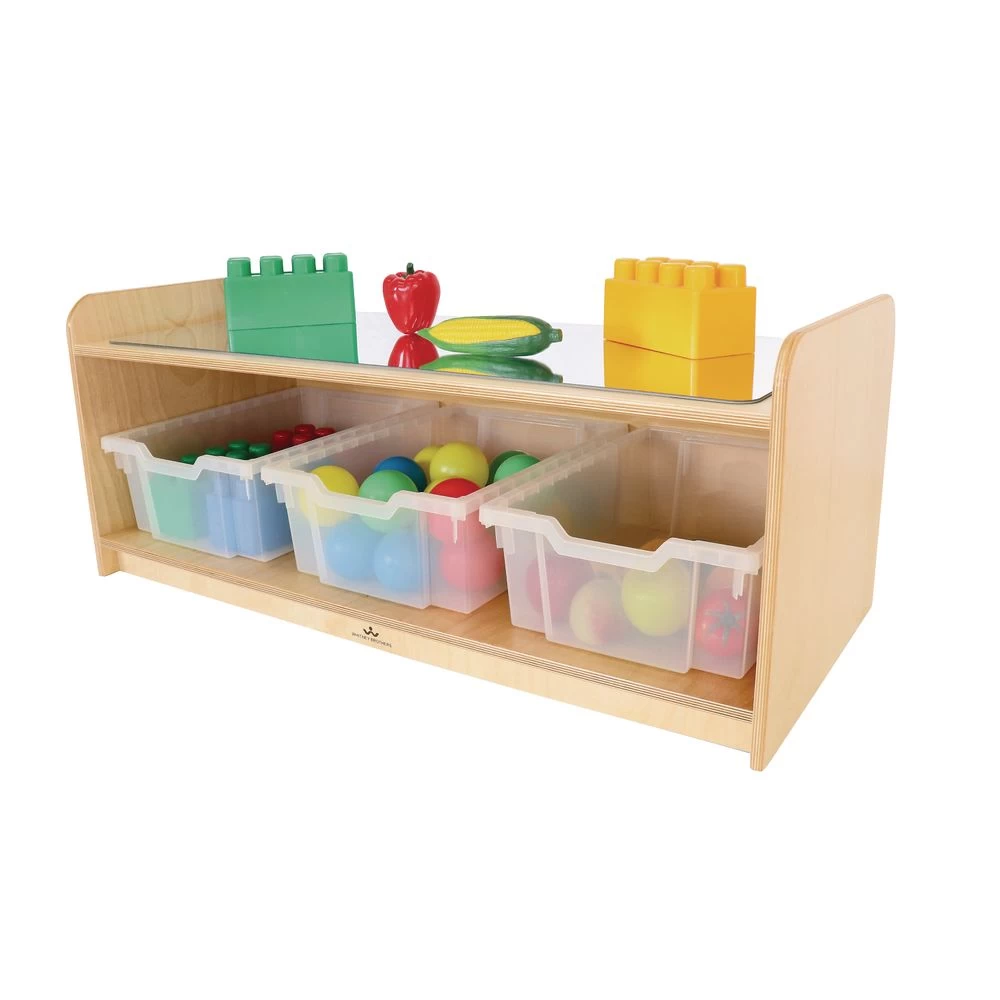 A great play space for first walkers! The acrylic mirror gives a stimulating new perspective to infants and toddlers, while encouraging cognitive, social, and motor development. The spacious shelf with storage bins underneath is ideal for organizing games, books, manipulatives, and more. Perfect for use in classrooms, daycares, and playrooms.