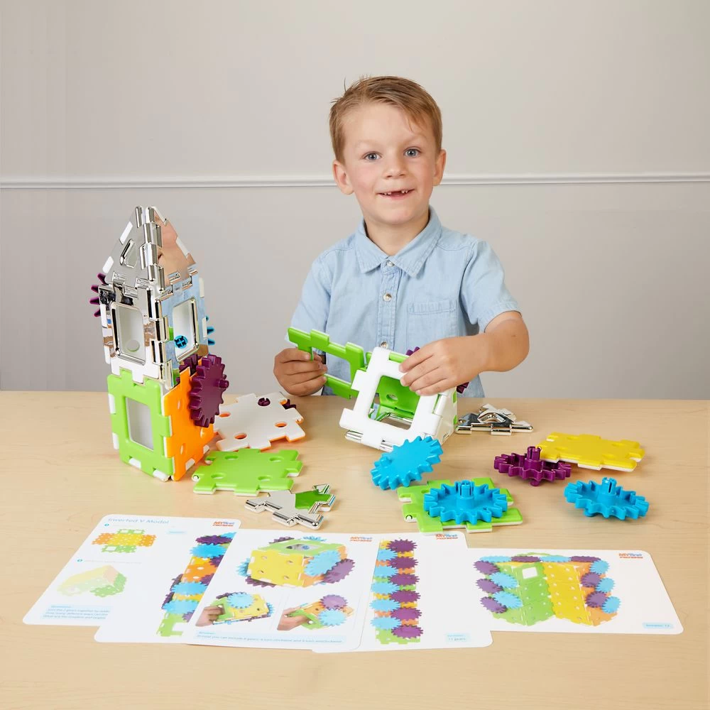 - CREATE: Children build their model and push the gears into the squares. Not only do the gears mesh together on a flat surface but also at an angle of 90 degrees.