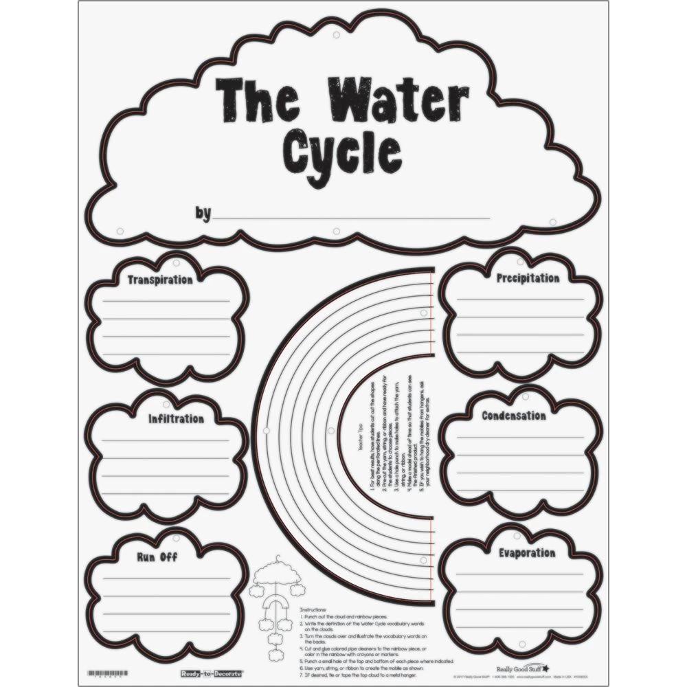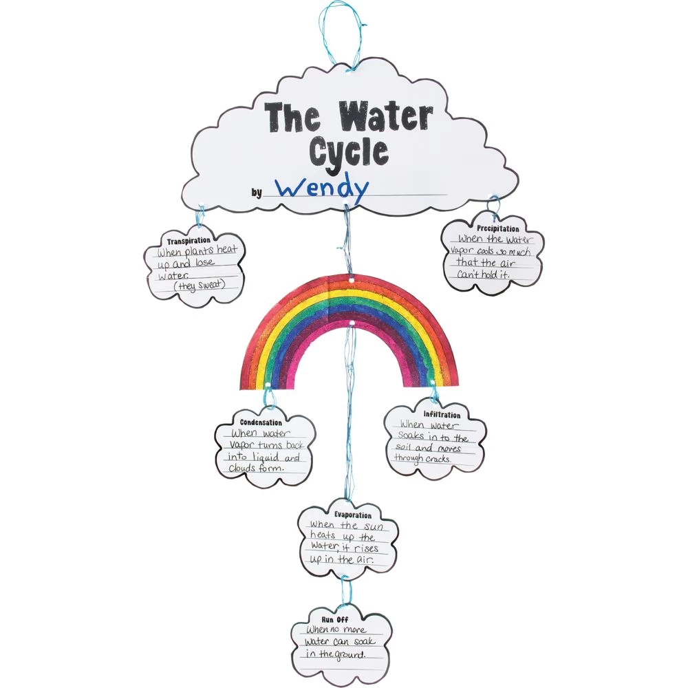 Students color the water cycle illustrations, label the backs, cut out the pieces, and assemble them into a mobile using yarn or string.
