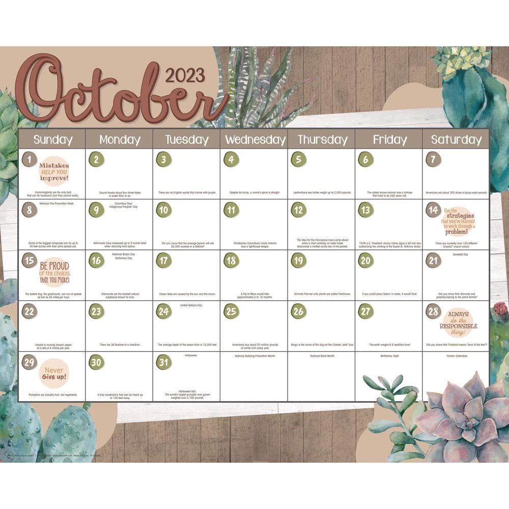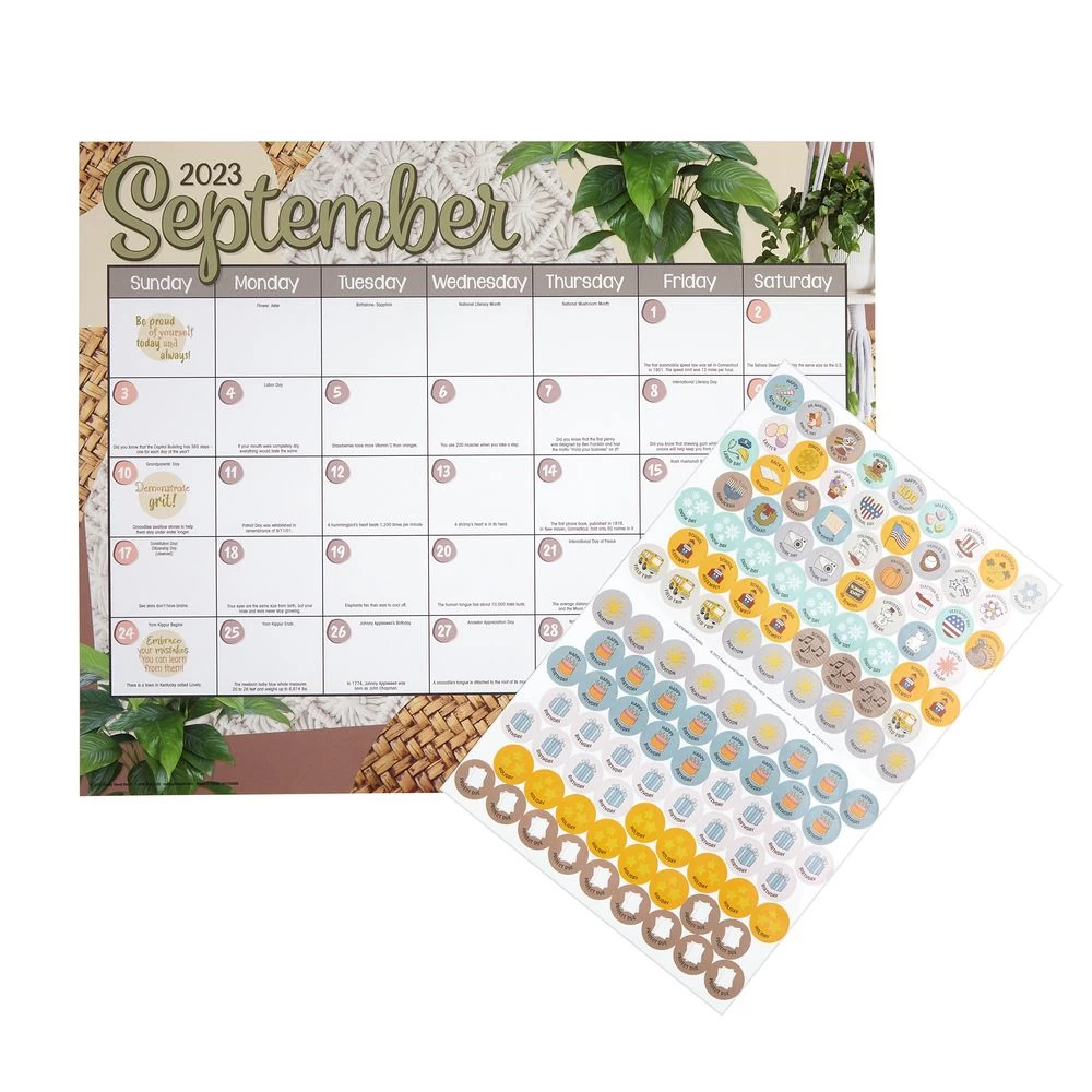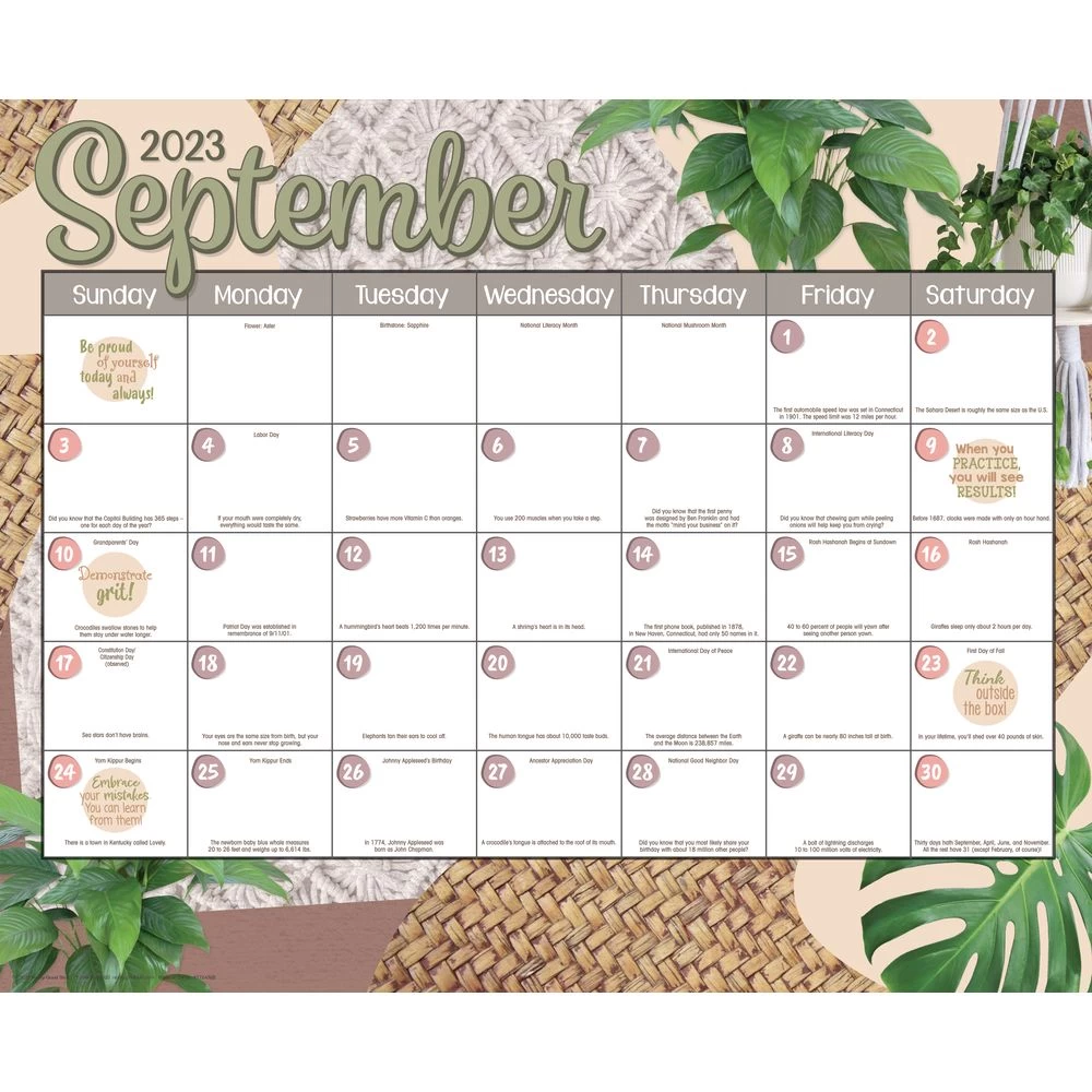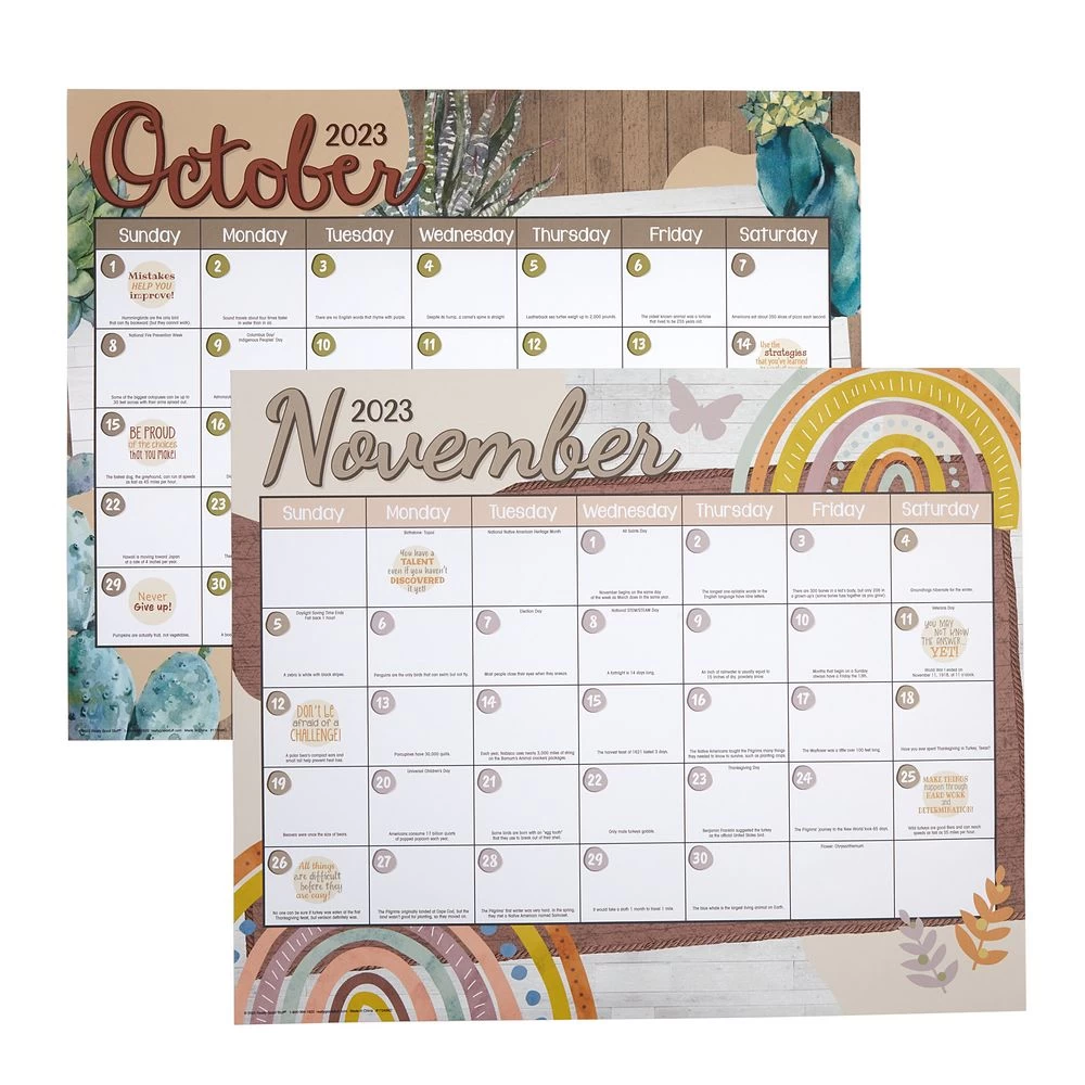 - WHAT YOU GET: 12 double-sided monthly calendar pages in two fun color schemes – Boho and Cool and Calm. Each page measures 22” x 18”. August 2023 – June 2024 pages include fun facts and positive affirmations; includes 120 Stickers (1” diameter) to plan and record classroom milestones and events.