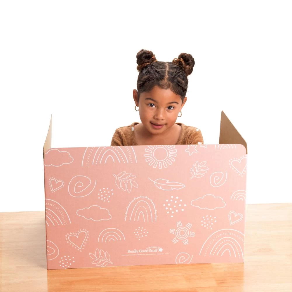 Keep eyes from wandering, eliminate distractions, and help ensure focus and concentration on a daily basis with Privacy Shields from Really Good Stuff. Our attractive and functional Privacy Shields are made of sturdy corrugated cardboard. Printed with a friendly, Boho theme, these privacy shields for desks are ideal for both pencil-and-paper and computer-based testing. This set includes 12 Privacy Shield with 3 each of 4 colors: Blue, Mint, Peach, and Clay. The sides are high enough to help students avoid distraction, but low enough for you to easily monitor students’ work. They’re great for everyday use in classrooms, computer labs, or at home to create a barrier. Students love setting up “offices” with them too! Designed to fit standard desks, Really Good Stuff three-panel privacy dividers have a 19″ x 12″ center panel and the two side panels are 14″ x 12″ each. This privacy shield folds up into thirds and fits inside most standard size desks for easy storage. It’s durable enough to withstand daily use on students’ desks and tabletops. These Privacy Shields will create a barrier to keep your students focused year after year.