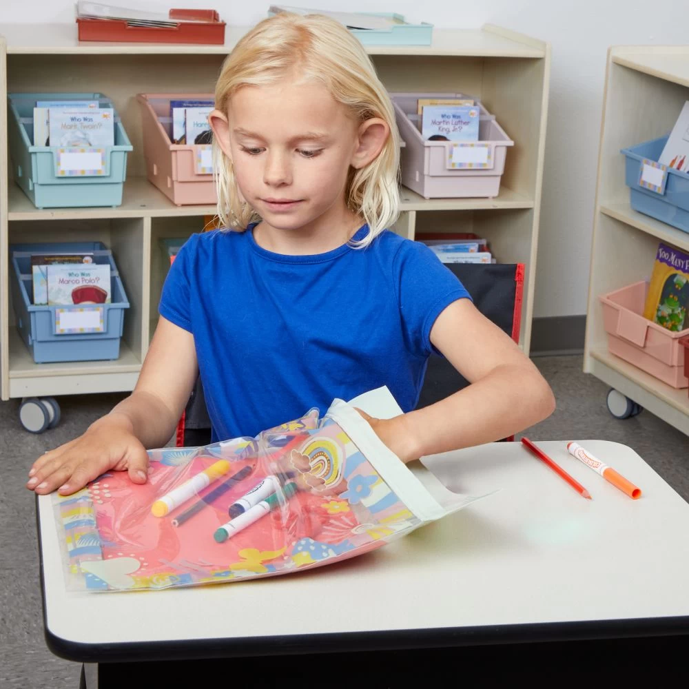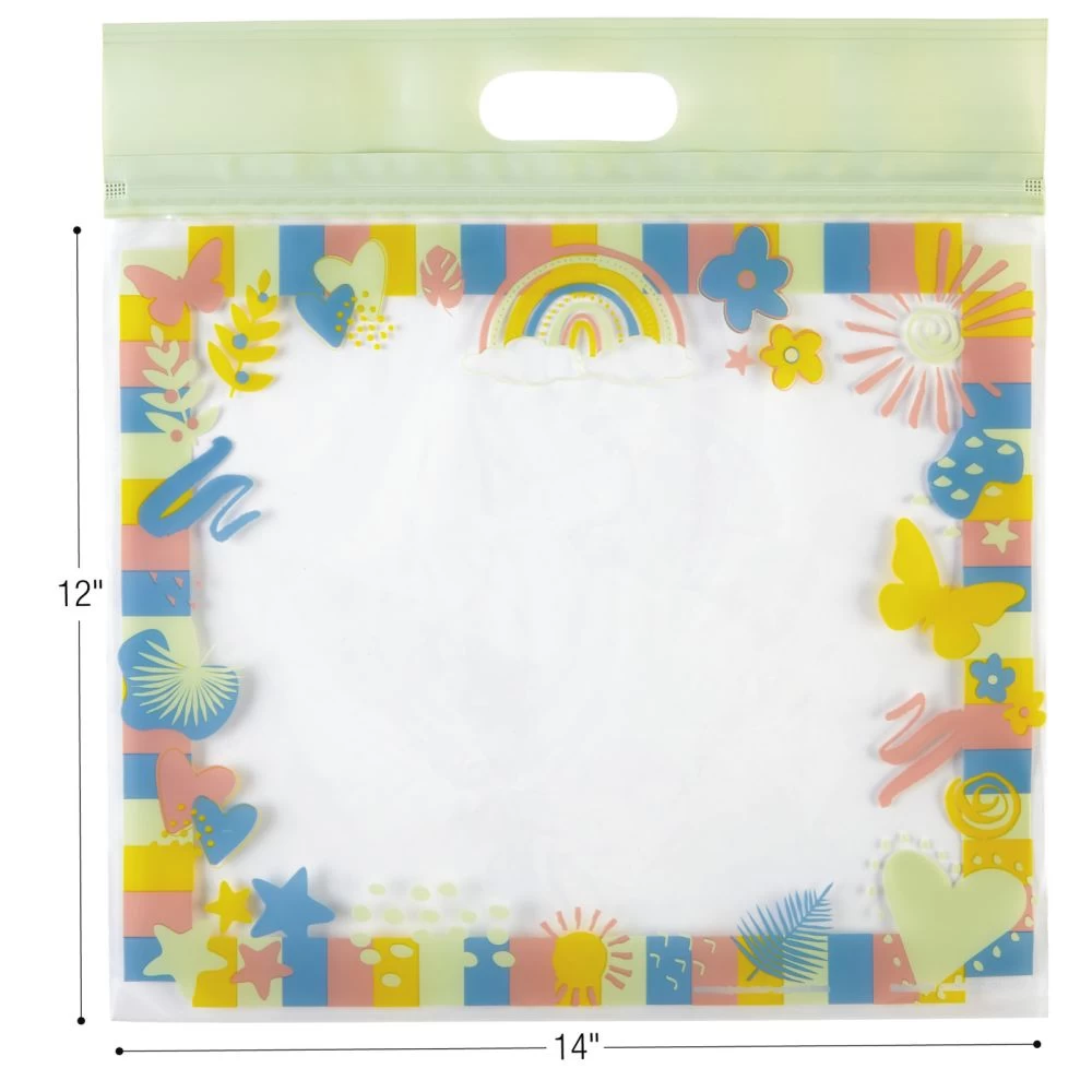 These Boho Storage Bags are great for classroom or home use. They can be used to store a large variety of items such as books, art supplies, projects, and more. The plastic material helps to protect items from wear and tear and is water-resistant when sealed. Use these bags in the classroom, at home, or any place that you need to help stay organized.