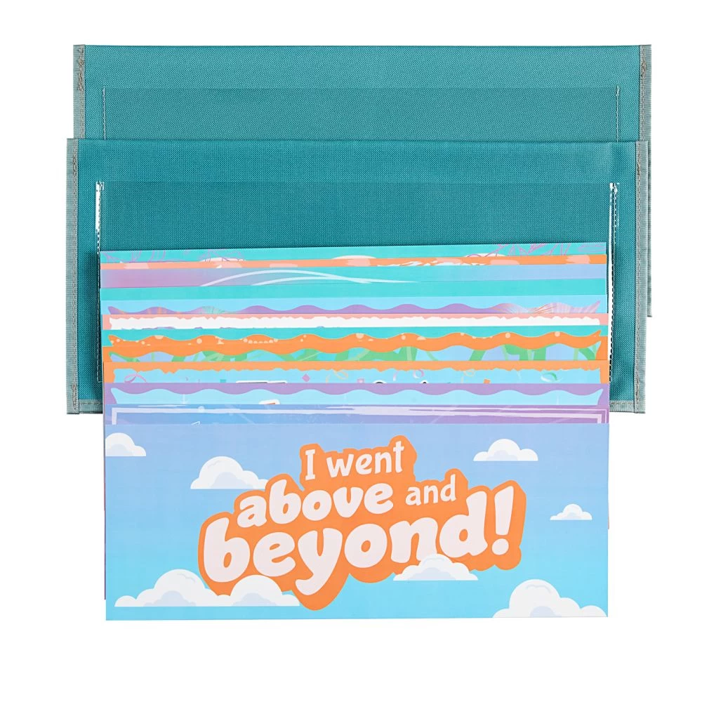 This set of two Chair Toppers is a perfect addition to any classroom. The set of two toppers comes with 12 cards that feature 21 different messages, and 3 blanks for customizing. Students will be proud when an “I” statement is placed on their chair or will feel special when you welcome them back or wish them a happy birthday. These Chair Toppers fit over the back of chair, even those which already have a chair pocket being used.