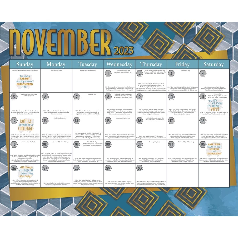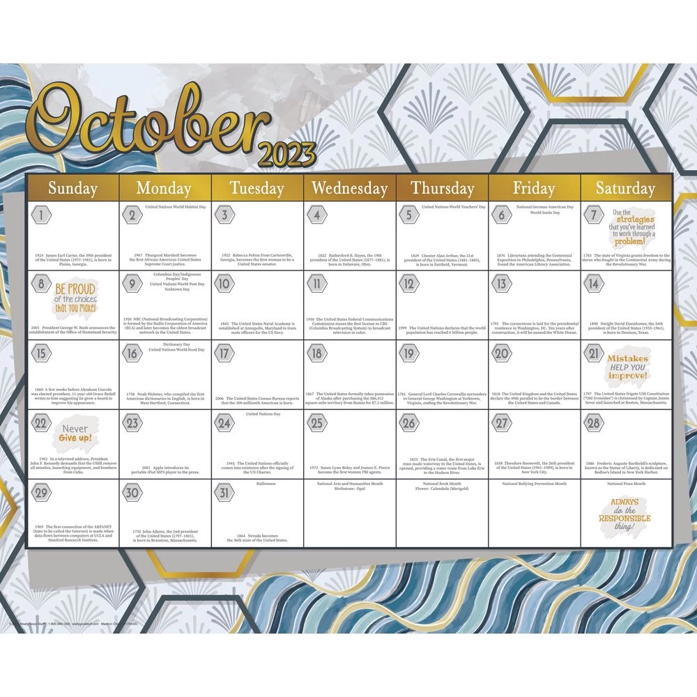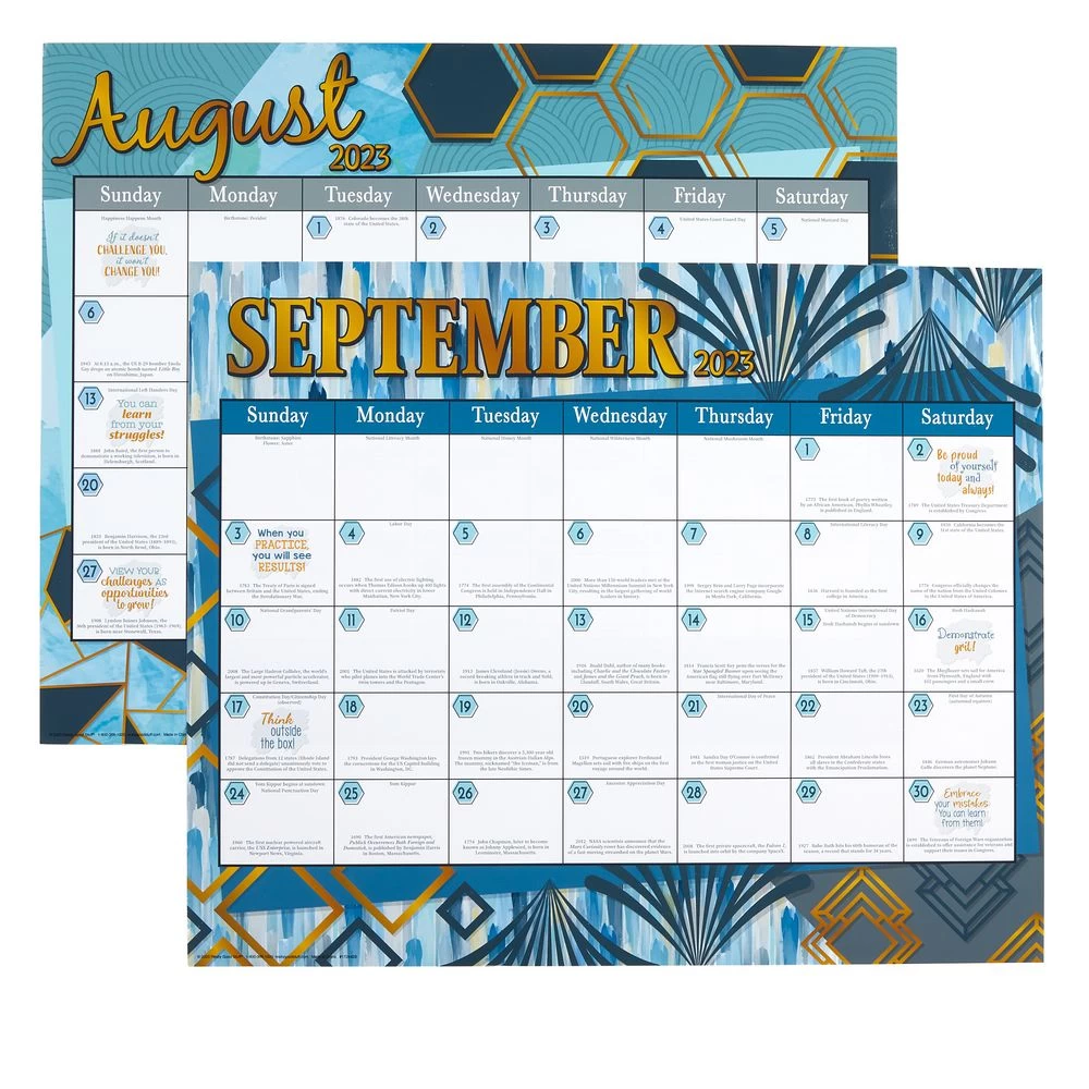 - WHAT YOU GET: 12 double-sided monthly calendar pages in two fun color schemes – Boho and Cool and Calm. Each page measures 22” x 18”. August 2023 – June 2024 pages include fun facts and positive affirmations; includes 120 Stickers (1” diameter) to plan and record classroom milestones and events.