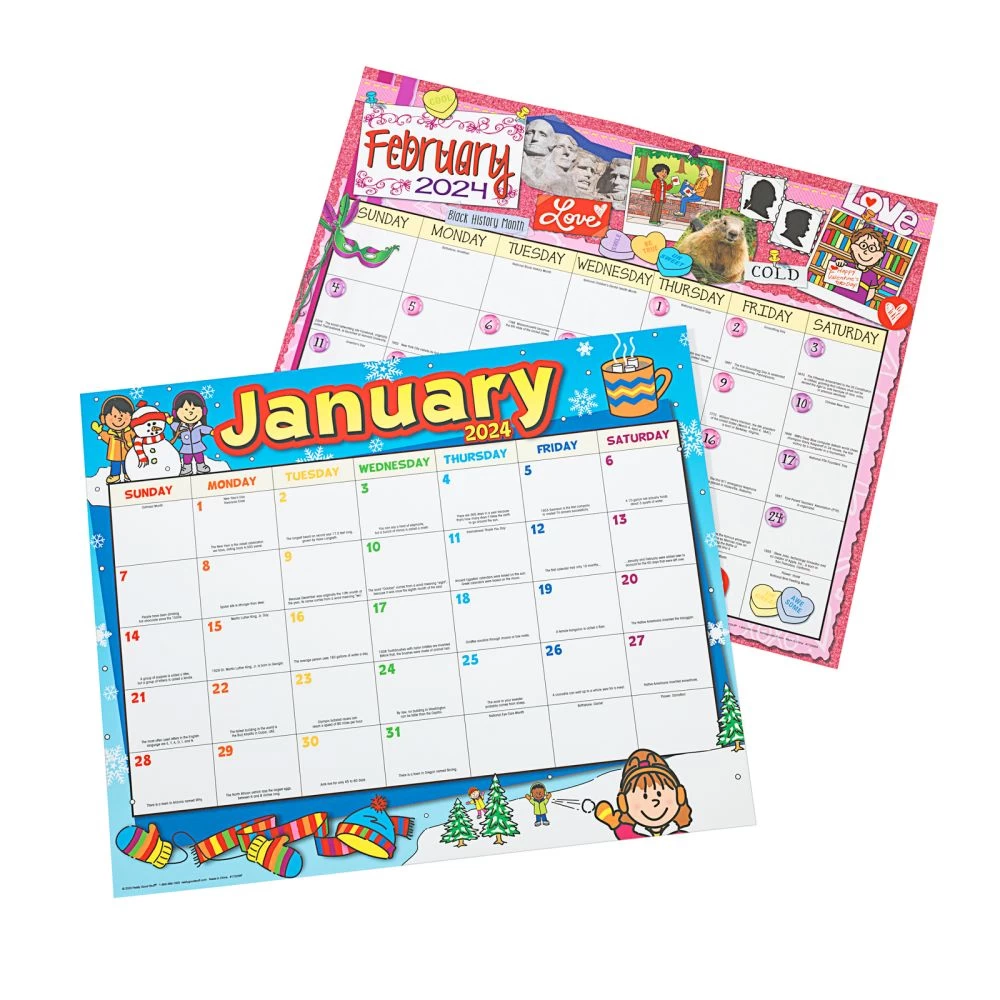 Double Sided Monthly Calendar Pages and Stickers 2023-2024. One side is for Primary, and the other is for Intermediate. Two in One! These bright, information-filled calendar pages feature fun facts for every day of the year. Each daily square offers plenty of room to record school and classroom events. Use the colorful stickers to highlight holidays, field trips, birthdays, and more. The 12 two-sided pages run from August 2023 through July 2024 and have primary art on one side and intermediate art on the other.