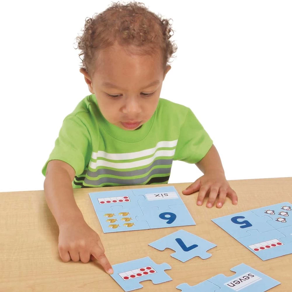 Provide plenty of counting practice with these self-checking puzzles. The pieces feature numerals, number words, ten-frames, and number sets in a subitized pattern. With one puzzle for each number from 1u201310, little ones will hone their matching and numeracy skills.