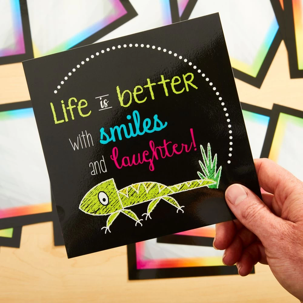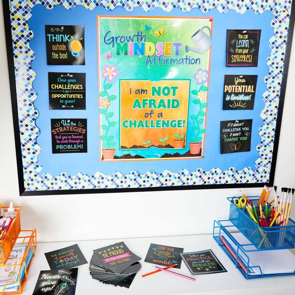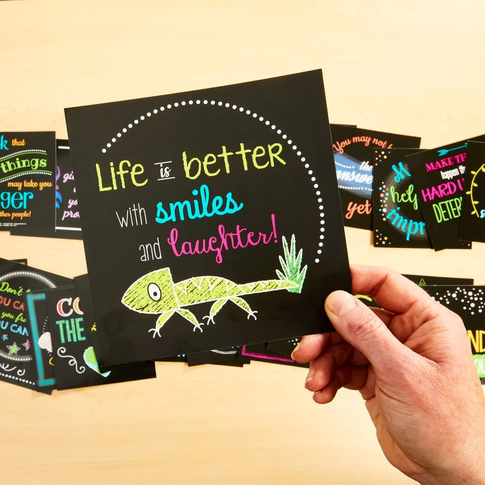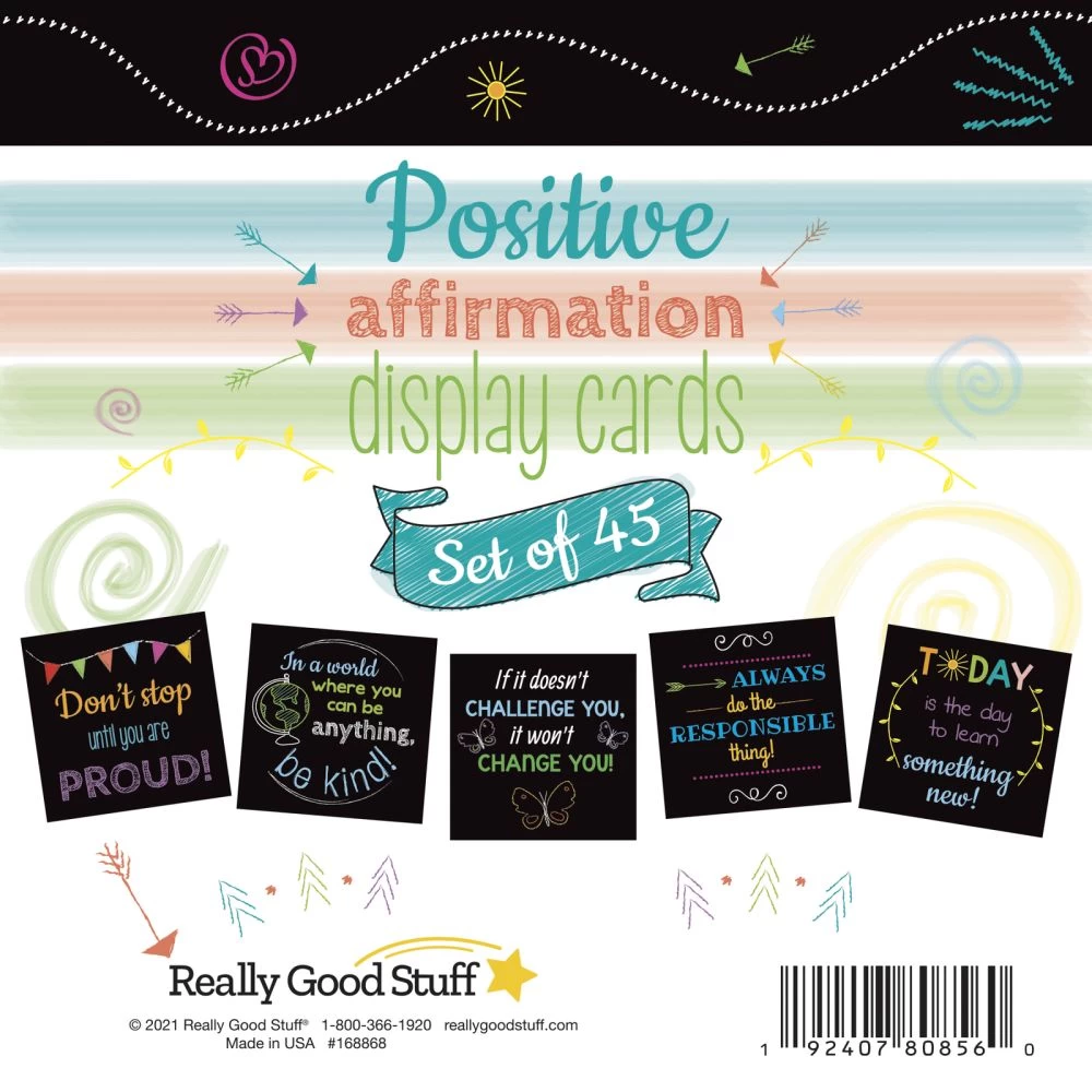 - POSITIVE AFFIRMATIONS: This set includes 45 unique cards with unique sayings on each. Affirmations like “Think outside the box!”, “Mistakes help you improve!”, and “Don’t be afraid of a challenge!” are used to send words of encouragement out into your home or classroom.
