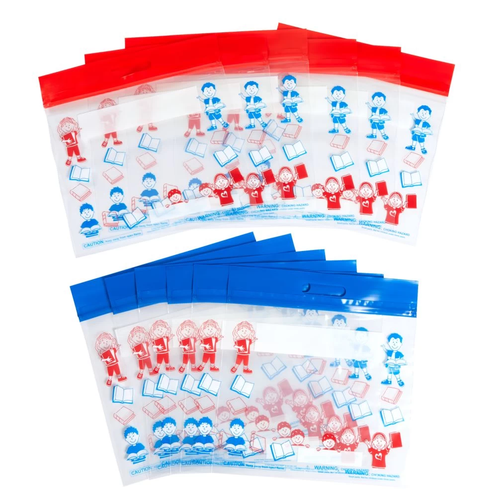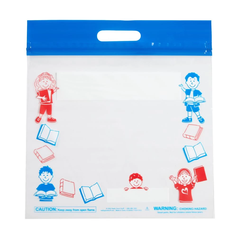 Thick plastic bags with handle and press and seal closure are just the thing to send reading books home with students. Also helpful for clearing away classroom clutter, cleaning out desks, storing materials for centers, and much more. Colorful cheerful Really Good Stuff Kids design; blank area for listing contents.