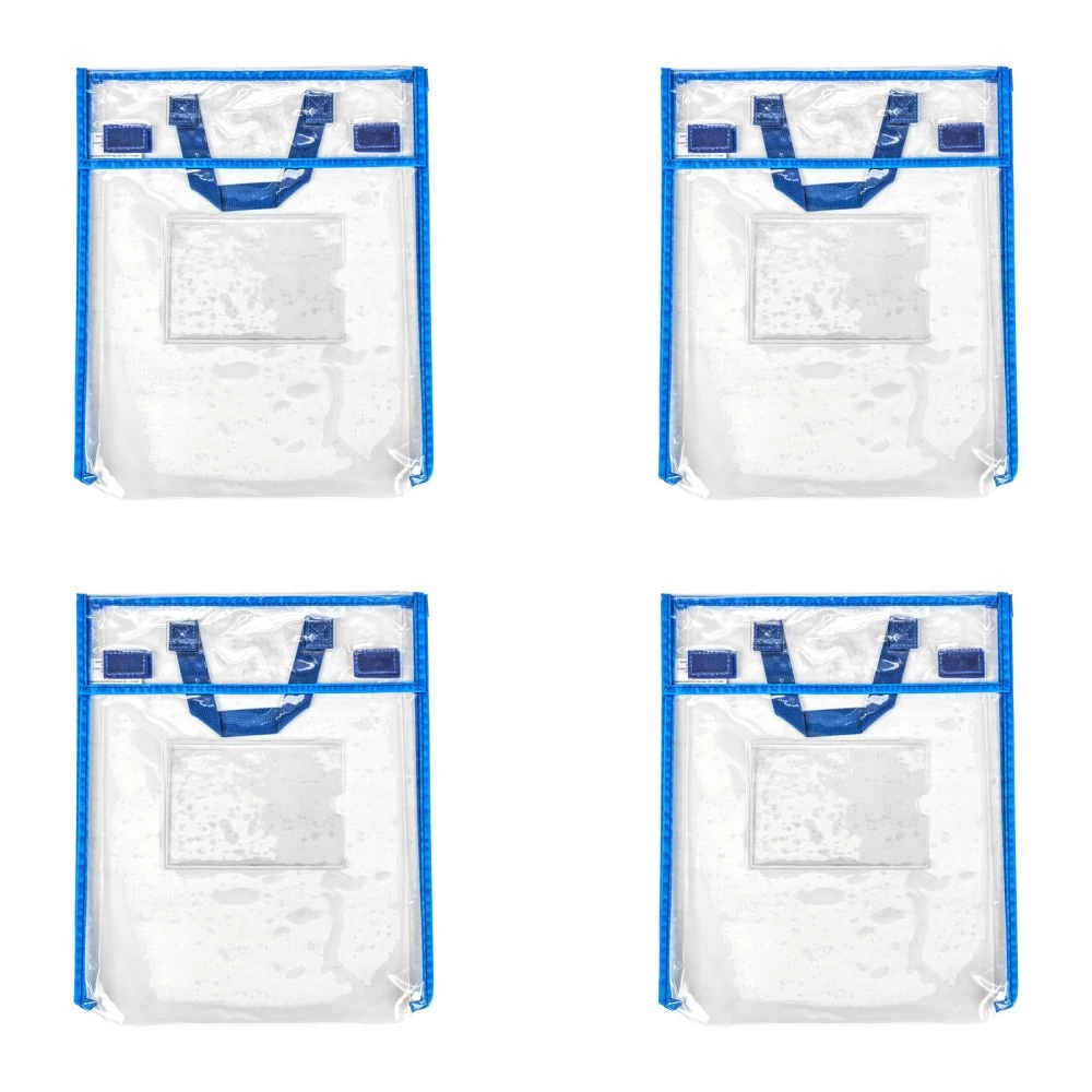 Keep books and classroom tools safe and organized with this stylish storage solution! Be confident that books and assignments will make it from school to home and back (in one piece) with Really Good Stuff Book Pouches. Keep books, folders, flash cards and homework together for students to take back and forth to school or to keep organized in the house. The book pouch measures 12 in x 1 in x 15 in, designed with plenty of space for classroom materials and learning on-the-go. Each clear book pouch features hook and loop closures that stay put, a 6.25 in x 4.5 in clear name tag pocket on the front side (name tag not included), and a cool and calm blue piping with sturdy, stitched on handle. For independent work time, hang the bag for students to access their materials quickly and easily. Also helpful for clearing away classroom clutter, cleaning out desks, storing materials for centers, and much more! The clear bag lets students and teachers see and retrieve items with ease, and the durable, wipeable vinyl makes for a sturdy bag that can be cleaned quickly for repeated use!