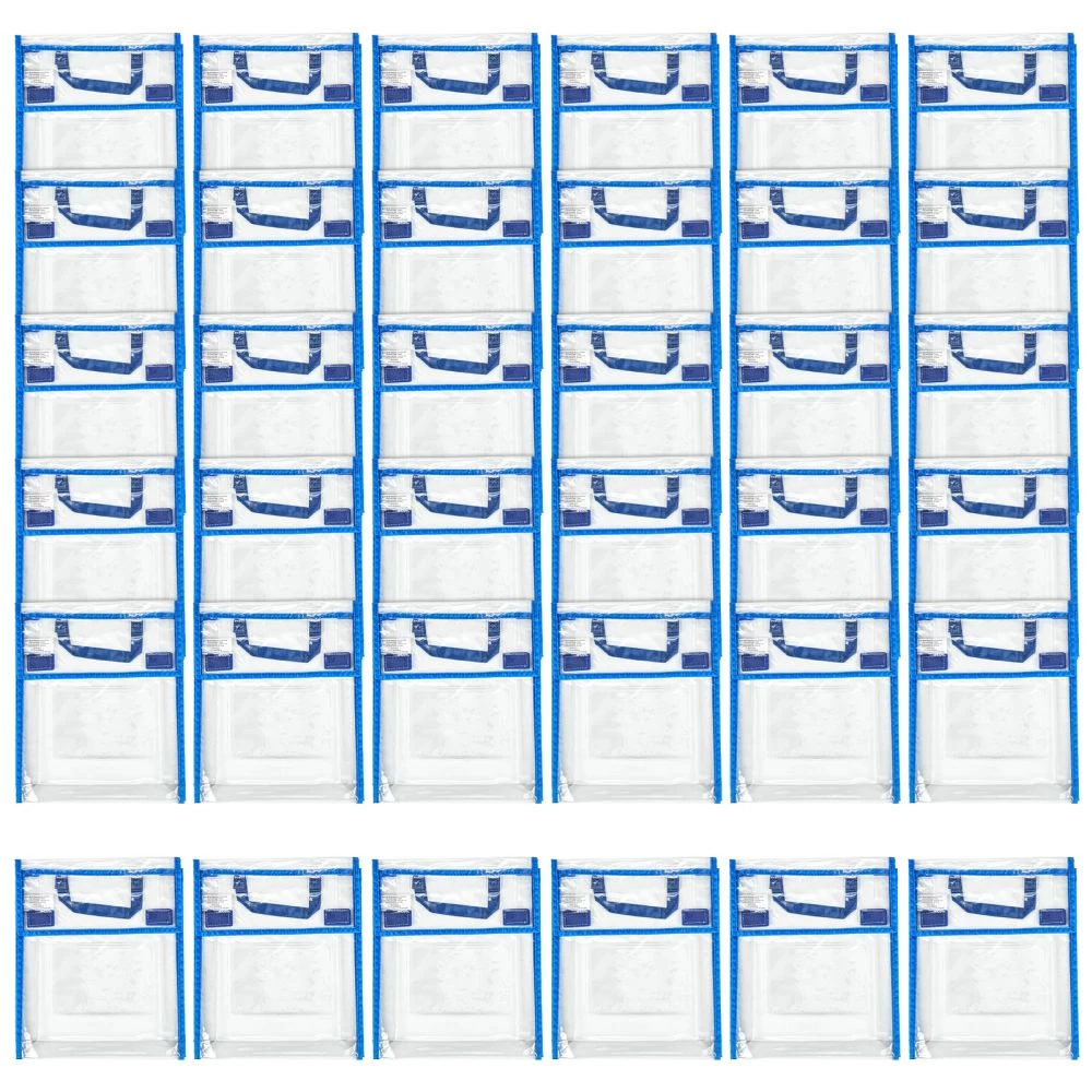 Keep books and classroom tools safe and organized with this stylish storage solution! Be confident that books and assignments will make it from school to home and back (in one piece) with Really Good Stuff Book Pouches. Keep books, folders, flash cards and homework together for students to take back and forth to school or to keep organized in the house. The book pouch measures 10 in x 2 in x 12 in designed with plenty of space for classroom materials and learning on-the-go. Each clear book pouch features hook and loop closures that stay put, a 6.25 in x 4.5 in clear name tag pocket on the front side (name tag not included), and a cool and calm blue piping with sturdy, stitched on handle. For independent work time, hang the bag for students to access their materials quickly and easily. Also helpful for clearing away classroom clutter, cleaning out desks, storing materials for centers, and much more! The clear bag lets students and teachers see and retrieve items with ease, and the durable, wipeable vinyl makes for a sturdy bag that can be cleaned quickly for repeated use!