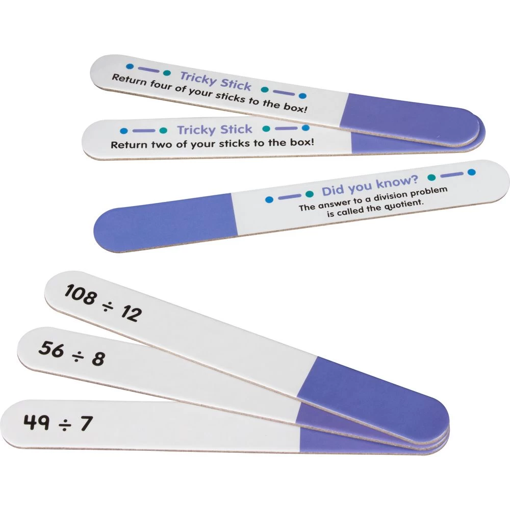 Students just pull a stick out of the box and solve the division problem. They check the answer hidden in the design on the back of the stick and keep the stick if they are correct. But watch out… if they pull out a tricky stick, some of their sticks go back in the box.