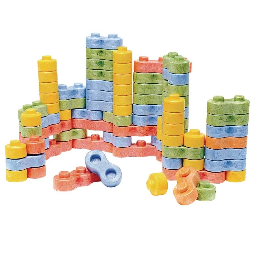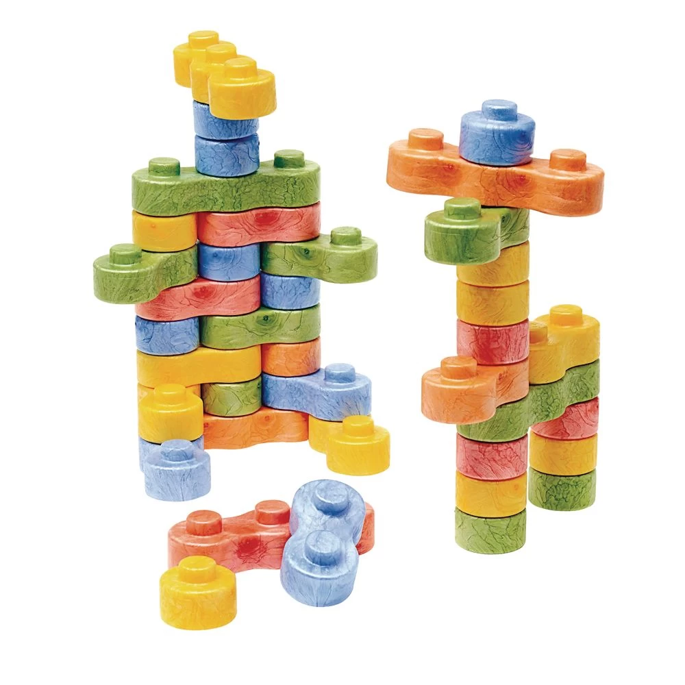 Light weight, circular building blocks with a circular shape that enables them to rotate! Made of the recyclable, biodegradable material EXPLA, this new, innovative Italian material is soft to the touch, washable and unbreakable. 80 pieces in 3 different shapes that come in 5 colors: blue, yellow, green, red and orange.
