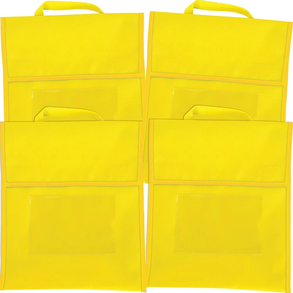 Keep Books And Papers Safe And Clean In Fabric Pouches In A Choice Of ColorsThese water-repellent nylon fabric book pouches sport a 1″ gusset to hold plenty of books, folders, and homework. They feature durable, non-rip seams; a sturdy, stitched-on handle; secure hook-and-loop closures; and a clear pocket for a name tag. Order a solid-color set of four in a choice of seven colors. Trim and handle match the pouch.