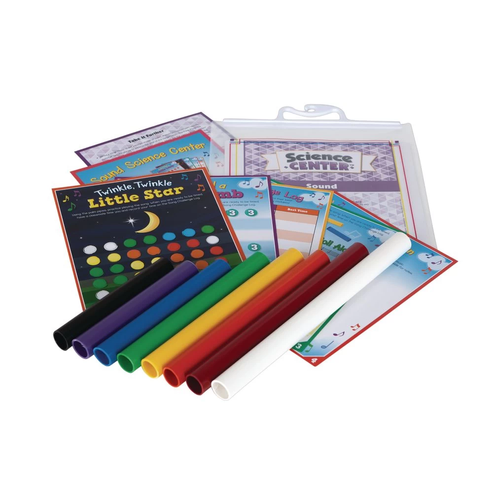 1 – instruction card; size 8″ x 10″ * 1 Vocabulary card; size 8″ x 10″ * 5 song cards * 10″ x 8″ * 8 color coded pipes * varying sizes * 4 Page Repro * 11″ x 17″ * 1 hanging plastic bag * Size: 11″ by 13″