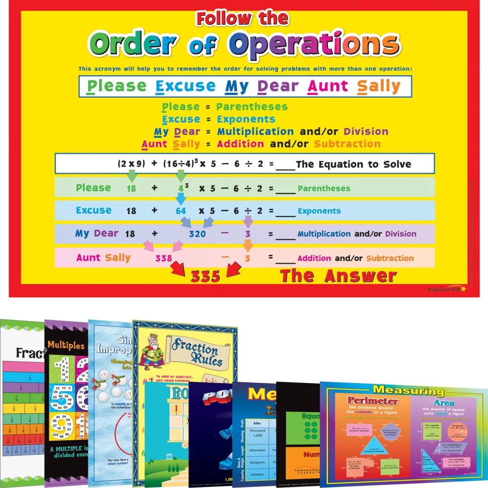 10 double-sided posters * laminated * Size: 19″ by 12″ each * Titles:Order of Operations * Basic Properties of Numbers * Measuring * Decimals * Percentages * and Fractions * Multiplication Strategies * Decimals * Factors and Multiples * Metric Meanings * Powers of 10 * Roman Numerals * Numbers from 1 to 200 * Fraction Rules * Simplifying Improper Fractions * Counting Change * Equivalent Fractions * Order of Operations (GEMS) * Fraction Bars * Multiplication Table * Place Value * Multiples of Numbers 1-12