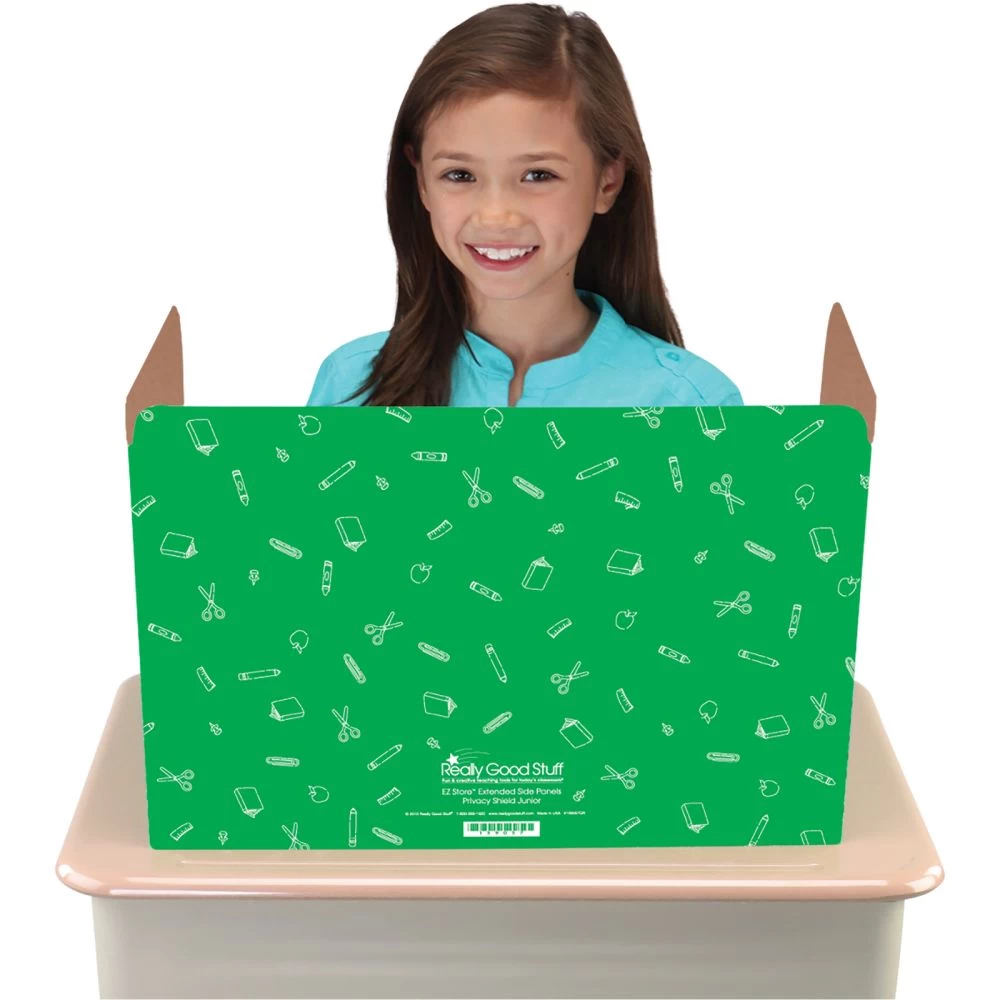 Keep eyes from wandering, eliminate distractions and help ensure focus and concentration on a daily basis with Privacy Shields from Really Good Stuff. Our attractive and functional Privacy Shields are made of sturdy corrugated cardboard.Printed with a whimsical school supplies pattern in a classic red, blue and green. These privacy shields for desks are ideal for both pencil-and-paper and computer-based testing (including PARCC and other standardized tests). The sides are high enough to help students avoid distraction, but low enough for you to easily monitor students’ work. They’re great for everyday use in classrooms, computer labs, or at home to create a barrier. Students love setting up “offices” with them too!Designed to fit standard desks, Really Good Stuff three-panel privacy dividers have a 19″ x 12″ center panel and the two side panels are 14″ x 12″ each. This privacy shield folds up into thirds and fits inside most standard size desks for easy storage. It’s durable enough to withstand daily use on students’ desks and tabletops. These Privacy Shields will create a barrier to keep your students focused year after year.*STYLISH AND USEFUL: Includes (12) three-panel sturdy corrugated cardboard privacy shield. They are printed with a whimsical school supplies pattern in a classic red, blue and green color. The center panel is 19″ x 12″ and the two side panels are 14″ x 12″ each.*HELP STUDENTS FOCUS: These privacy shields are a must-have for teachers and parents because they help eliminate distractions in the classroom or at home.*CREATE A WORK STATION BARRIER: The sides are high enough to help students focus, but low enough for you to easily monitor students work. Students feel like they have their own work station.*DURABLE AND EASY TO STORE: Our privacy shields are built to last. Made with sturdy corrugated cardboard to withstand daily use on students’ desks and tabletops. Folds up into thirds for easy storage and fits in most standard size desks. Really Good Stuff’s Privacy Shields are built to last year after year.*GROUPING: Great for grouping or color-coding by group!<iframe width=”560″ height=”315″ src=”https://www.youtube.com/embed/n16j0D_ahdM” frameborder=”0″ allow=”accelerometer; autoplay; clipboard-write; encrypted-media; gyroscope; picture-in-picture” allowfullscreen></iframe>