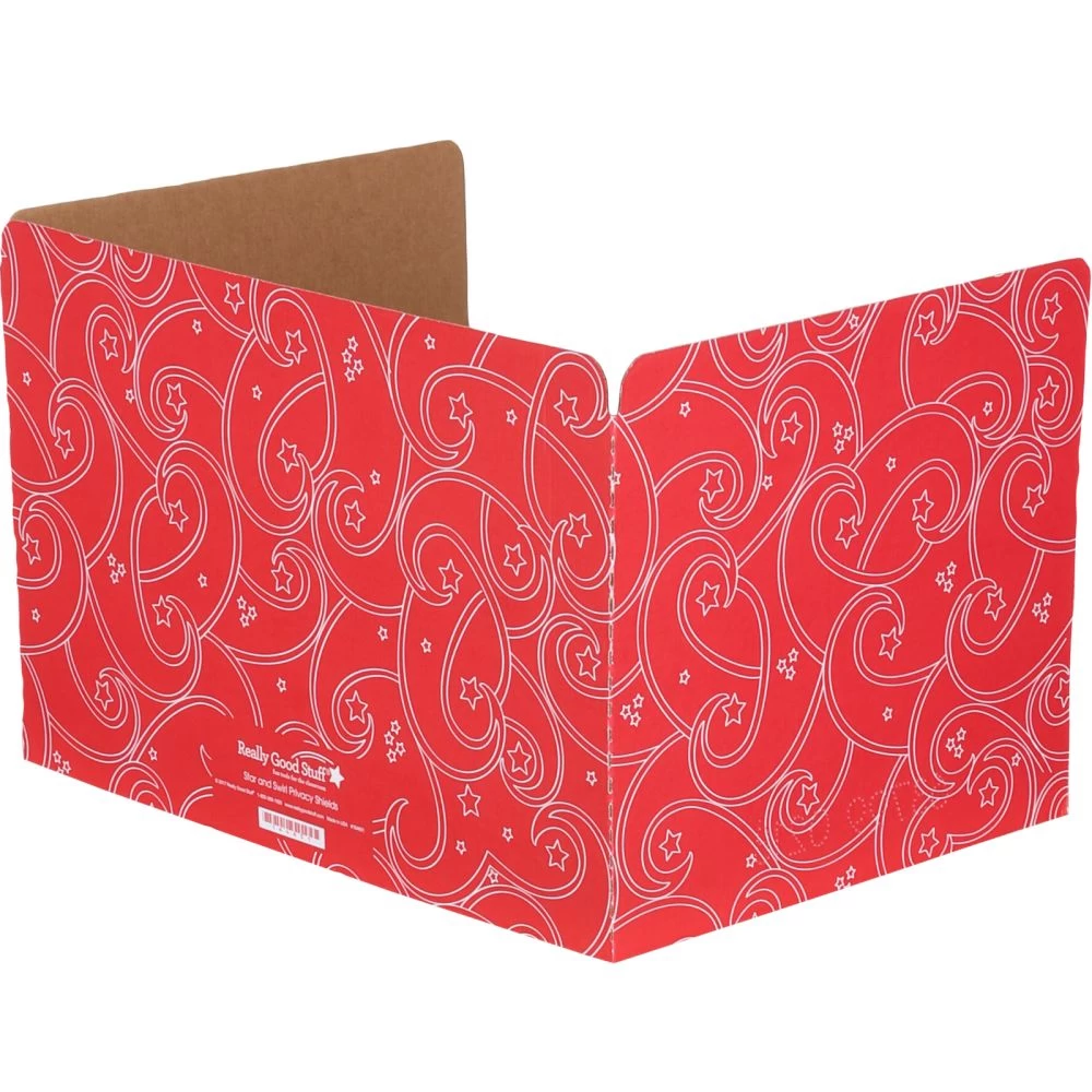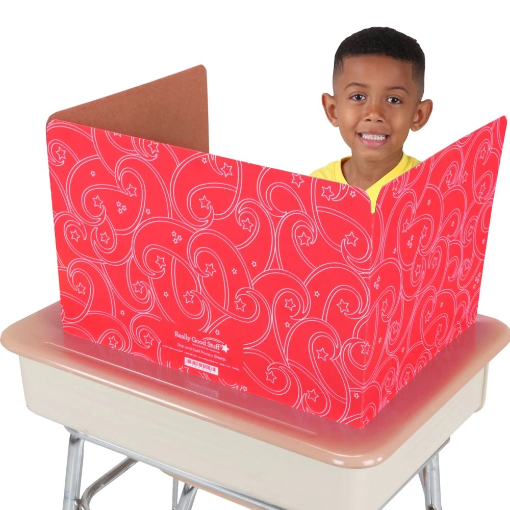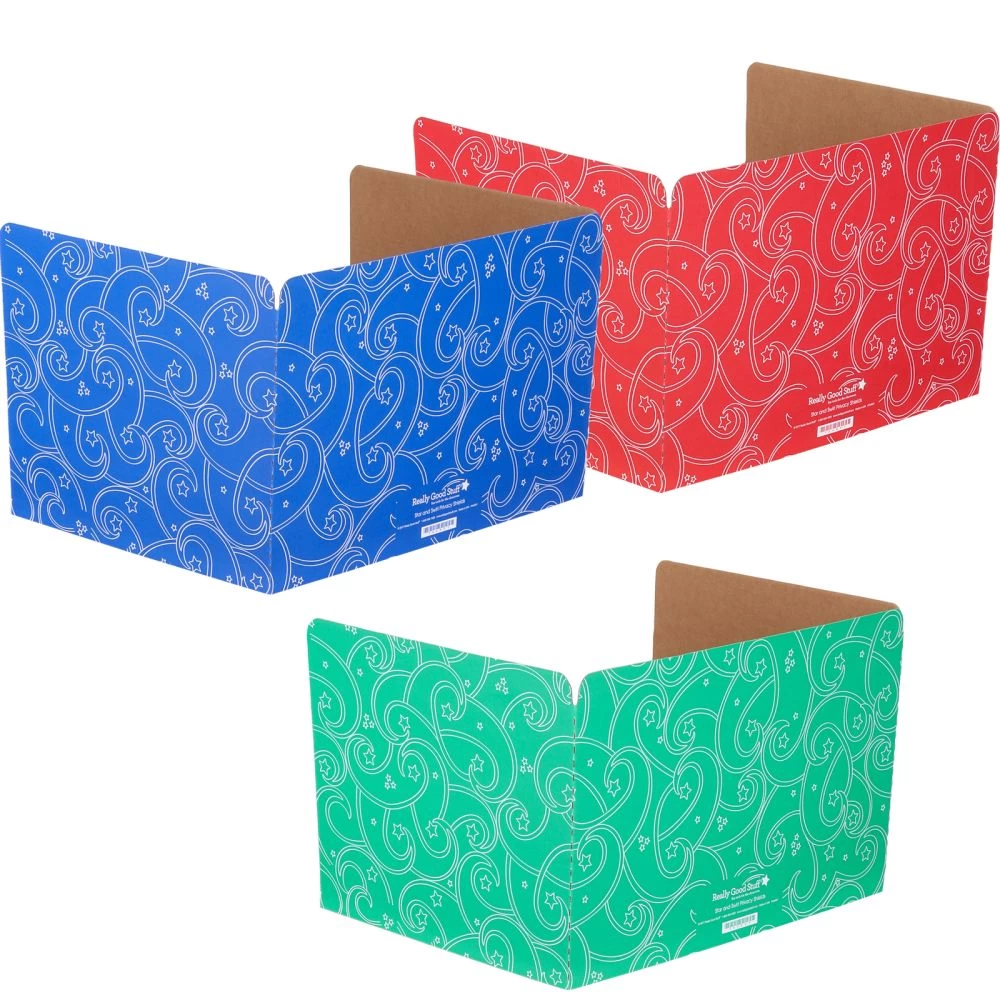 Keep eyes from wandering, eliminate distractions and help ensure focus and concentration on a daily basis with Privacy Shields from Really Good Stuff. Our attractive and functional Privacy Shields are made of sturdy corrugated cardboard.Printed with a whimsical stars and swirl pattern in a classic red, blue and green. These privacy shields for desks are ideal for both pencil-and-paper and computer-based testing (including PARCC and other standardized tests). The sides are high enough to help students avoid distraction, but low enough for you to easily monitor students’ work. They’re great for everyday use in classrooms, computer labs, or at home to create a barrier. Students love setting up “offices” with them too!Designed to fit standard desks, Really Good Stuff three-panel privacy dividers have a 19″ x 12″ center panel and the two side panels are 14″ x 12″ each. This privacy shield folds up into thirds and fits inside most standard size desks for easy storage. It’s durable enough to withstand daily use on students’ desks and tabletops. These Privacy Shields will create a barrier to keep your students focused year after year.*STYLISH AND USEFUL: Includes (12) three-panel sturdy corrugated cardboard privacy shield. They are printed with whimsical stars and swirl pattern in a classic red, blue and green. Each pack includes 4 of each color. The center panel is 19″ x 12″ and the two side panels are 14″ x 12″ each.*HELP STUDENTS FOCUS: These privacy shields are a must-have for teachers and parents because they help eliminate distractions in the classroom or at home.*CREATE A WORK STATION BARRIER: The sides are high enough to help students focus, but low enough for you to easily monitor students work. Students feel like they have their own work station.*DURABLE AND EASY TO STORE: Our privacy shields are built to last. Made with sturdy corrugated cardboard to withstand daily use on students’ desks and tabletops. Folds up into thirds for easy storage and fits in most standard size desks. Really Good Stuff’s Privacy Shields are built to last year after year.*GROUPING: Great for grouping or color-coding by group!<iframe width=”560″ height=”315″ src=”https://www.youtube.com/embed/n16j0D_ahdM” frameborder=”0″ allow=”accelerometer; autoplay; clipboard-write; encrypted-media; gyroscope; picture-in-picture” allowfullscreen></iframe>