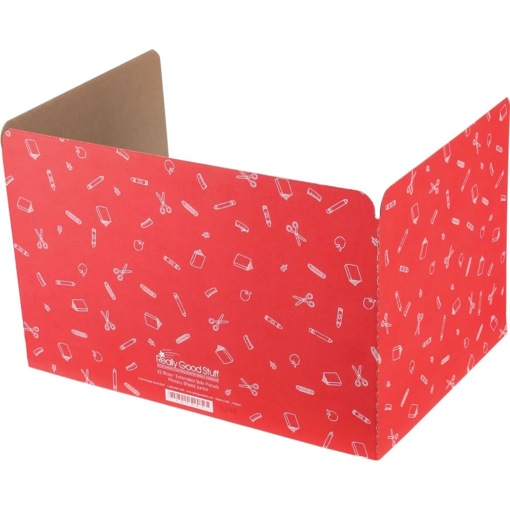 Provide Students with Extra Privacy and a Clear View of Classroom Lessons with High Gloss Privacy ShieldsKeep eyes from wandering, eliminate distractions and help ensure focus and concentration on a daily basis with Privacy Shields from Really Good Stuff. Our attractive and functional Privacy Shields are made of sturdy corrugated cardboard.Printed with a whimsical school supplies pattern in a classic blue. These privacy shields for desks are ideal for both pencil-and-paper and computer-based testing (including PARCC and other standardized tests). The sides are high enough to help students avoid distraction, but low enough for you to easily monitor students’ work. They’re great for everyday use in classrooms, computer labs, or at home to create a barrier. Students love setting up “offices” with them too!Designed to fit standard desks, Really Good Stuff three-panel privacy dividers have a 19″ x 12″ center panel and the two side panels are 14″ x 12″ each. This privacy shield folds up into thirds and fits inside most standard size desks for easy storage. It’s durable enough to withstand daily use on students’ desks and tabletops. These Privacy Shields will create a barrier to keep your students focused year after year.*STYLISH AND USEFUL: Includes (12) three-panel sturdy corrugated cardboard privacy shield. They are printed with a whimsical school supplies pattern in a classic blue color. The center panel is 19″ x 12″ and the two side panels are 14″ x 12″ each.*HELP STUDENTS FOCUS: These privacy shields are a must-have for teachers and parents because they help eliminate distractions in the classroom or at home.*CREATE A WORK STATION BARRIER: The sides are high enough to help students focus, but low enough for you to easily monitor students work. Students feel like they have their own work station.*DURABLE AND EASY TO STORE: Our privacy shields are built to last. Made with sturdy corrugated cardboard to withstand daily use on students’ desks and tabletops. Folds up into thirds for easy storage and fits in most standard size desks. Really Good Stuff’s Privacy Shields are built to last year after year.*ECONOMICAL: These are a low-cost, long-term option that can be used in any classroom or home year after year.